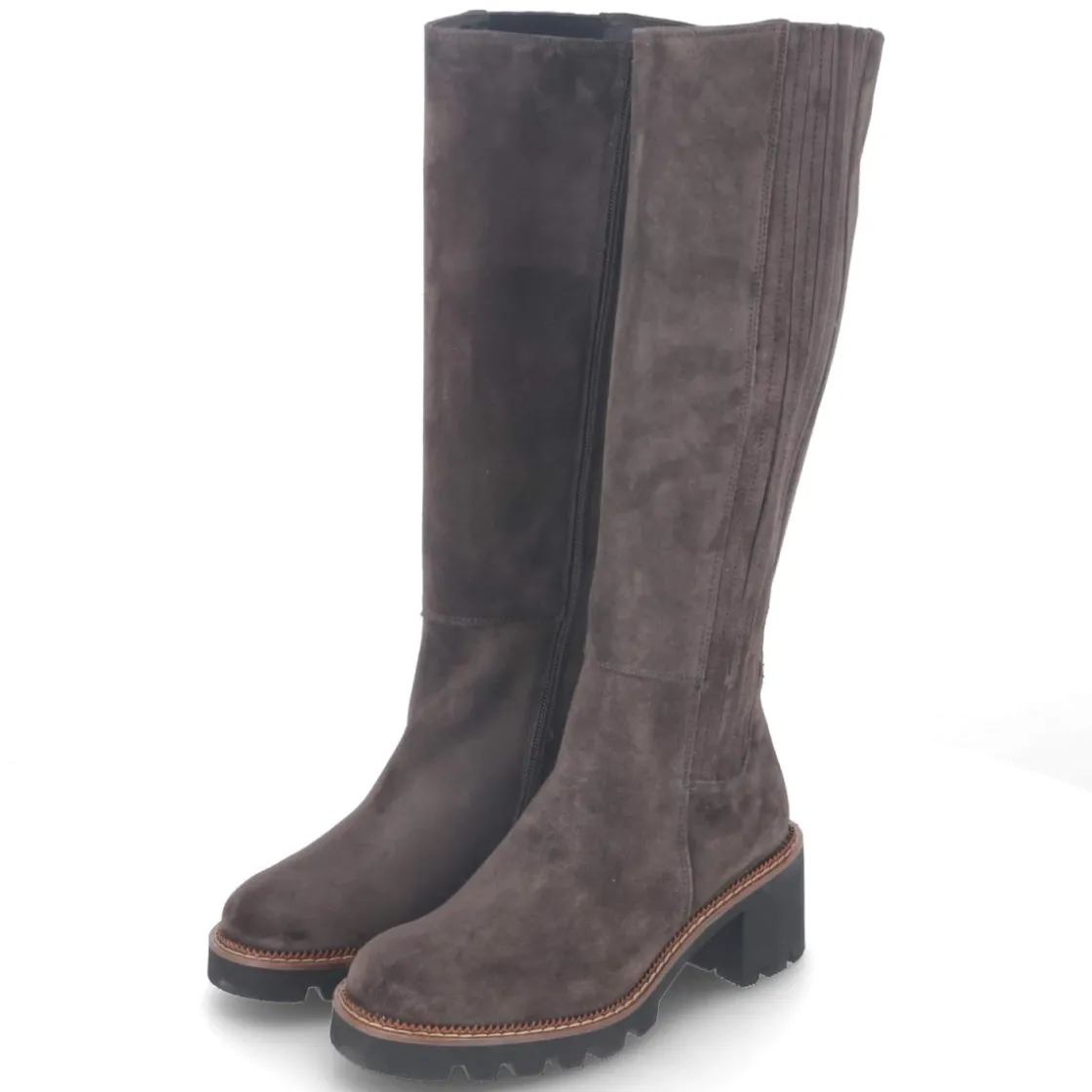 Der braune Damen-Stiefel von Paul Green verbindet zeitlose Eleganz mit verlässlichem Komfort. Weiches Rauleder in langlebiger Echtleder-Qualität umschmeichelt das Bein, der rund gearbeitete Leisten verleiht dem Look eine feminine Note. Dank 6 cm hohem Blockabsatz entsteht eine angenehme Höhe mit sicherem Stand, während die rutschhemmende Laufsohle bei jedem Schritt überzeugt. Ein seitlicher Reißverschluss erleichtert das Anziehen, ein Elastikeinsatz am Spann sorgt für flexible Passform. Mit einem Schaft von ca. 37 cm Höhe und etwa 36 cm Umfang schmiegt sich der Stiefel harmonisch an. Die lederne Decksohle unterstützt ein natürliches Fußklima, die Passform fällt normal aus. Modetipp: Zu Midikleid und Wollmantel entsteht ein urbaner Look; für den Alltag wirkt die braune Nuance besonders edel in Kombination mit Denim und Strick.