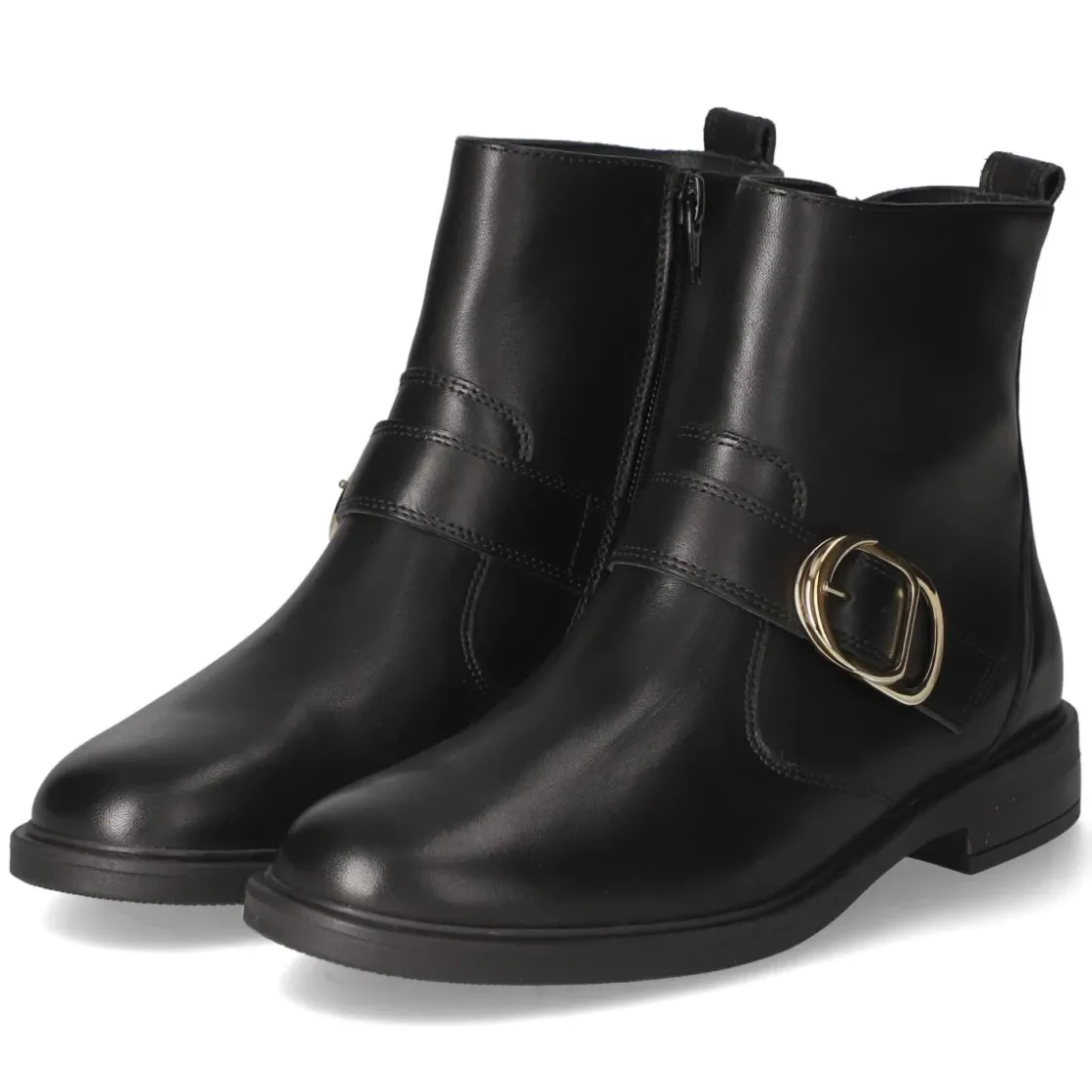 Die schwarzen Damen-Stiefeletten von Paul Green verbinden klare Linien mit hochwertiger Verarbeitung. Glattes, langlebiges Echtleder formt eine zeitlose Silhouette mit runder Spitze, während der bequeme Reißverschlußeinstieg und eine kleine Anziehhilfe schnelles Hineinschlüpfen ermöglichen. Ein gepolstertes Lederfußbett und die Lederdecksohle sorgen für angenehm gedämpften Auftritt, die flexible, griffige Laufsohle bietet Halt auf urbanen Wegen. Der 3 cm hohe Blockabsatz unterstützt natürliches Abrollen und macht die Stiefelette zum ausdauernden Alltagsbegleiter. Eine verstärkte Ferse fördert Stabilität, der feine Zierriemen mit goldener Zierschnalle setzt einen eleganten Akzent. Das Modell fällt normal aus und passt zu vielfältigen Looks – von Office bis Weekend. Modetipp: Mit gekürzten Straight-Jeans, Wollmantel und dezentem Goldschmuck harmoniert die Zierschnalle perfekt und verleiht dem Outfit klaren Modern Chic.