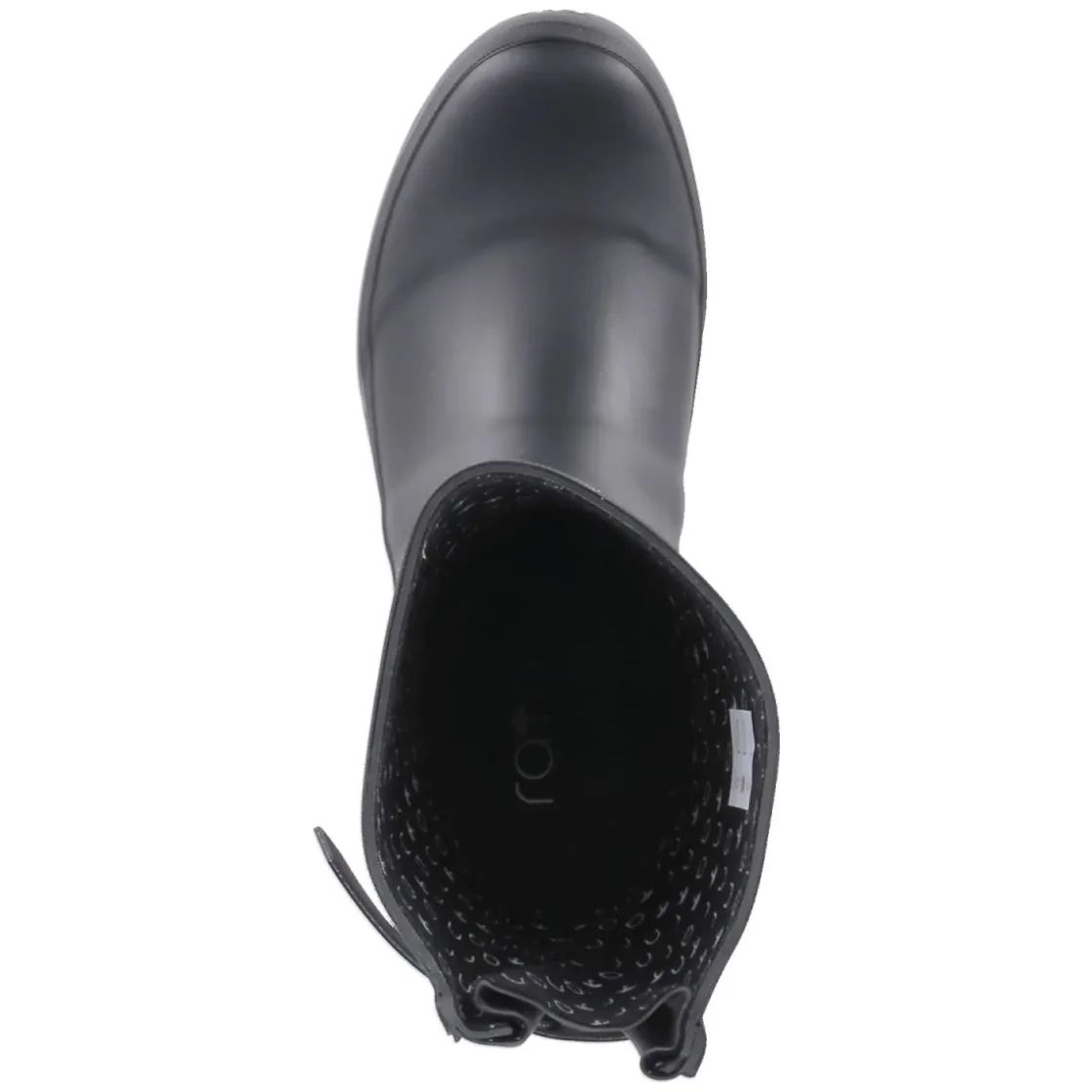 Der Gummistiefel BLOSS von Rajn verbindet funktionale Stärke mit femininer Note: Schwarzes Obermaterial aus Gummi trifft auf einen zarten Blumenprint in Pastelltönen. Das wasserabweisende Material, der runde Leisten und der 3 cm hohe Blockabsatz sorgen für trockenen, stabilen Komfort im Alltag. Textildecksohle und gepolstertes, herausnehmbares Wechselfußbett bieten angenehme Dämpfung, der unkomplizierte Einstieg ohne klassischen Verschluss macht das Anziehen leicht. Über den rückseitigen Riemen lässt sich die Schaftweite um bis zu 10 cm variieren. Reflektierende Details an der verstärkten Ferse erhöhen die Sichtbarkeit, ein verstärkter Fußrahmen und die flexible, rutschhemmende Profilsohle geben Halt auf nassem Untergrund. Fällt normal aus und überzeugt mit pflegeleichter Oberfläche. Modetipp: Zu gewachstem Parka und schmaler Jeans entsteht ein lässiger City-Regenlook.