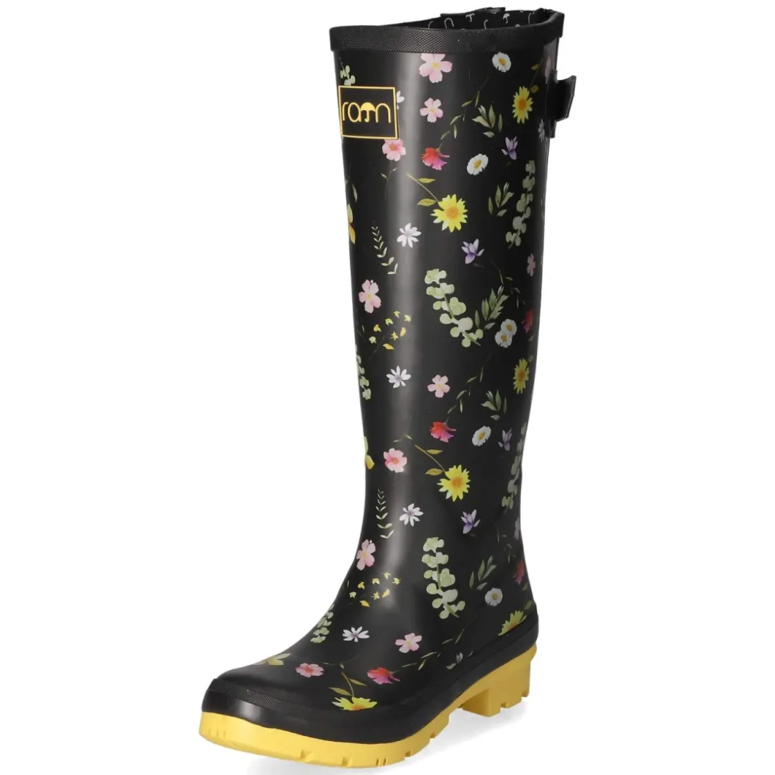 Der Gummistiefel FLOWERS von Rajn bringt Funktion und Charme zusammen: tiefes Schwarz wird von einem lebhaften Blumen-Print und gelbfarbenen Akzenten aufgefrischt, das Markenemblem setzt einen feinen Blickfang. Das wasserfeste Obermaterial aus Gummi schützt verlässlich, der 3 cm hohe Blockabsatz und die runde Spitze sorgen für sicheren Stand und entspannten Auftritt. Innen verwöhnt leichtes Textil, dazu ein gepolstertes Wechselfußbett, das bei Bedarf ausgetauscht werden kann. Der unkomplizierte Einstieg mit hinten verstellbarem Riemen passt die Weite an, verstärkter Fußrahmen und Ferse stabilisieren, die flexible, rutschhemmende Sohle greift souverän. Fällt normal aus und begleitet Damen mühelos durch Stadtregen, Gartenwege und Festivalwiesen. Modetipp: Kontraststark zu schwarzem Trench, groben Wollsocken und gelbem Bucket-Hat, der die Akzente aufnimmt.