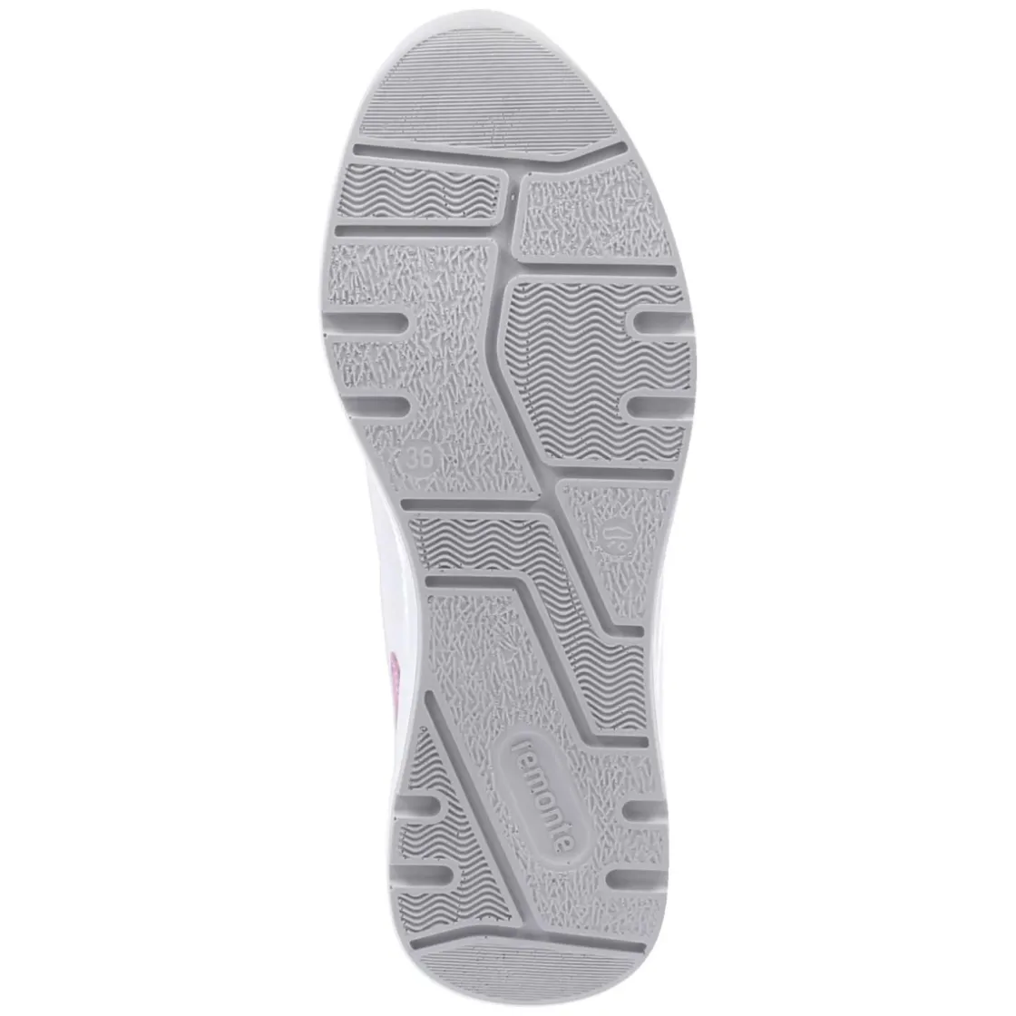 Der Low Sneaker von Remonte verbindet zeitloses Weiß mit einem modernen Material-Mix aus Leder und Synthetik. Rote, orange und rosafarbene Highlights setzen frische Akzente, während die gelabelten Details den sportiven Look abrunden. Die runde Schuhspitze, der gepolsterte Einstieg und die verstärkten Bereiche an Zehen und Ferse sorgen für ein angenehmes Tragegefühl im Alltag. Praktisch: Neben der Schnürung erleichtert ein zusätzlicher Reißverschluss das An- und Ausziehen. Die textile Decksohle liegt auf einem gepolsterten Wechselfußbett, das bei Bedarf ausgetauscht werden kann. Mit rutschhemmender Laufsohle und normaler Passform wird der Sneaker zum vielseitigen Begleiter für Stadt, Büro und Reise. Modetipp: Den cleanen Weißton mit hellen Jeans und einer lässigen Blazer-Variante kombinieren; die farbigen Highlights greifen Accessoires in Rot, Orange oder Rosa gekonnt auf.