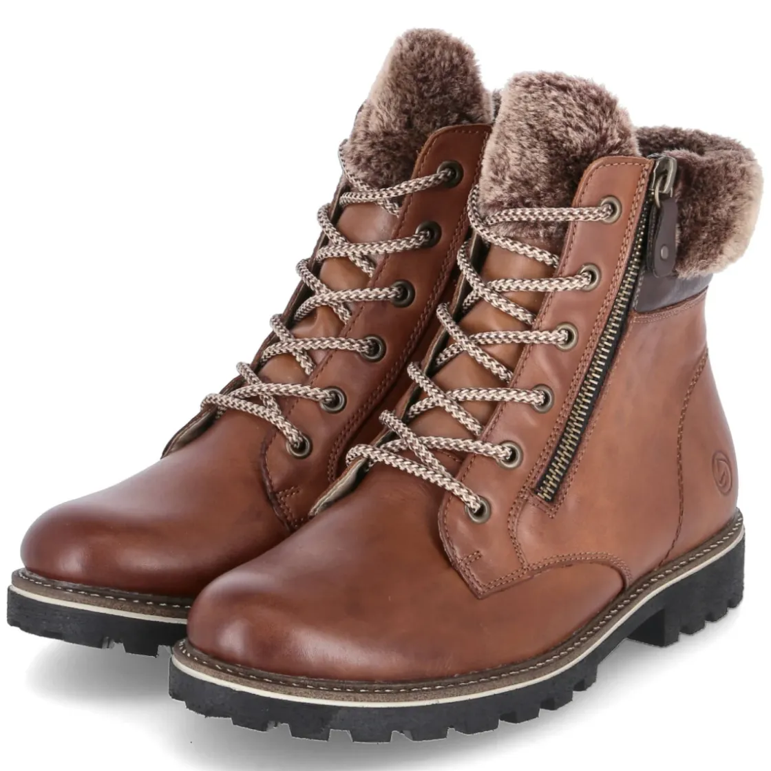 Die Winterstiefeletten von Remonte verbinden zeitloses Design mit funktionalen Details für kalte Tage. Das langlebige Echtleder in warmem Braun trifft auf textile Einsätze und eine Markenprägung, die dem Paar eine wertige Note geben. Ein rund gearbeiteter Leisten und der kleine Blockabsatz von 3 cm sorgen für ein angenehmes Abrollen, während die rutschhemmende Profilsohle sicheren Halt bietet. Innen verwöhnt warmes Lammfellfutter; das herausnehmbare Thermo‑Wechselfußbett mit Decksohle aus Leder passt sich dem Fuß an. Der Schaft schließt mit softem Kunstfellkragen ab. Durch die Kombination aus Schnürung und einem zusätzlichen seitlichen Reißverschluss gelingt das An- und Ausziehen mühelos. Der Schnitt fällt normal aus und eignet sich für den täglichen Einsatz bei winterlichen Bedingungen. Modetipp: In Kombination mit grob gestrickten Wollsocken, Cord-Culotte und Oversize-Mantel entsteht ein lässiger City-Look.