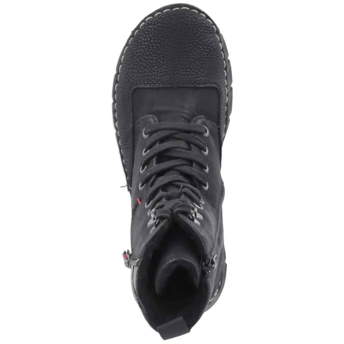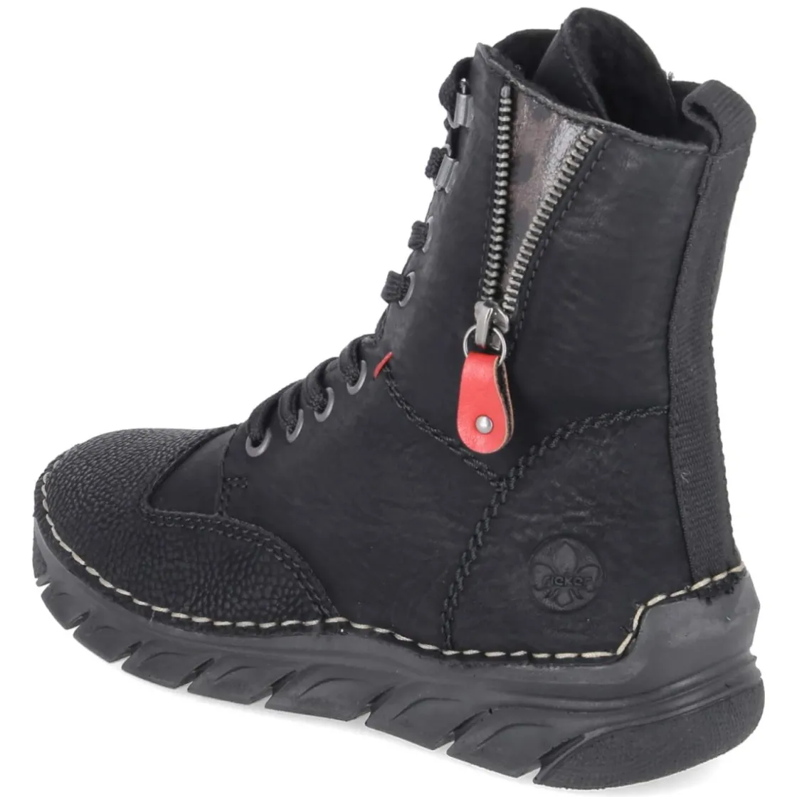 Der schwarze Damen-Boot von Rieker vereint wintertaugliche Wärme mit entspanntem Tragegefühl. Das pflegeleichte Synthetik-Obermaterial zeigt eine klare Linienführung, ergänzt durch einen Zierreißverschluss am Schaft, während die runde Spitze und der verstärkte Fersen- und Zehenbereich Alltagstauglichkeit unterstreichen. Warmfutter mit weichem Teddyfutter umschließt den Fuß, die Textil-Decksohle und das gepolsterte Fußbett sorgen für anhaltenden Komfort. Dank relaxtem Leichtgewicht und flexibler, rutschfester Laufsohle bleibt jeder Schritt angenehm und sicher. Der praktische Mix aus Schnürsenkeln und seitlichem Reißverschluss erleichtert den Einstieg, eine Anziehlasche unterstützt zusätzlich. Die Passform fällt normal aus, wodurch unkomplizierte Größenauswahl gelingt. Modetipp: Eine Kombination mit schwarzer Strumpfhose, Midirock in Wolloptik und Oversize-Strick schafft einen lässig-warmen City-Look.
