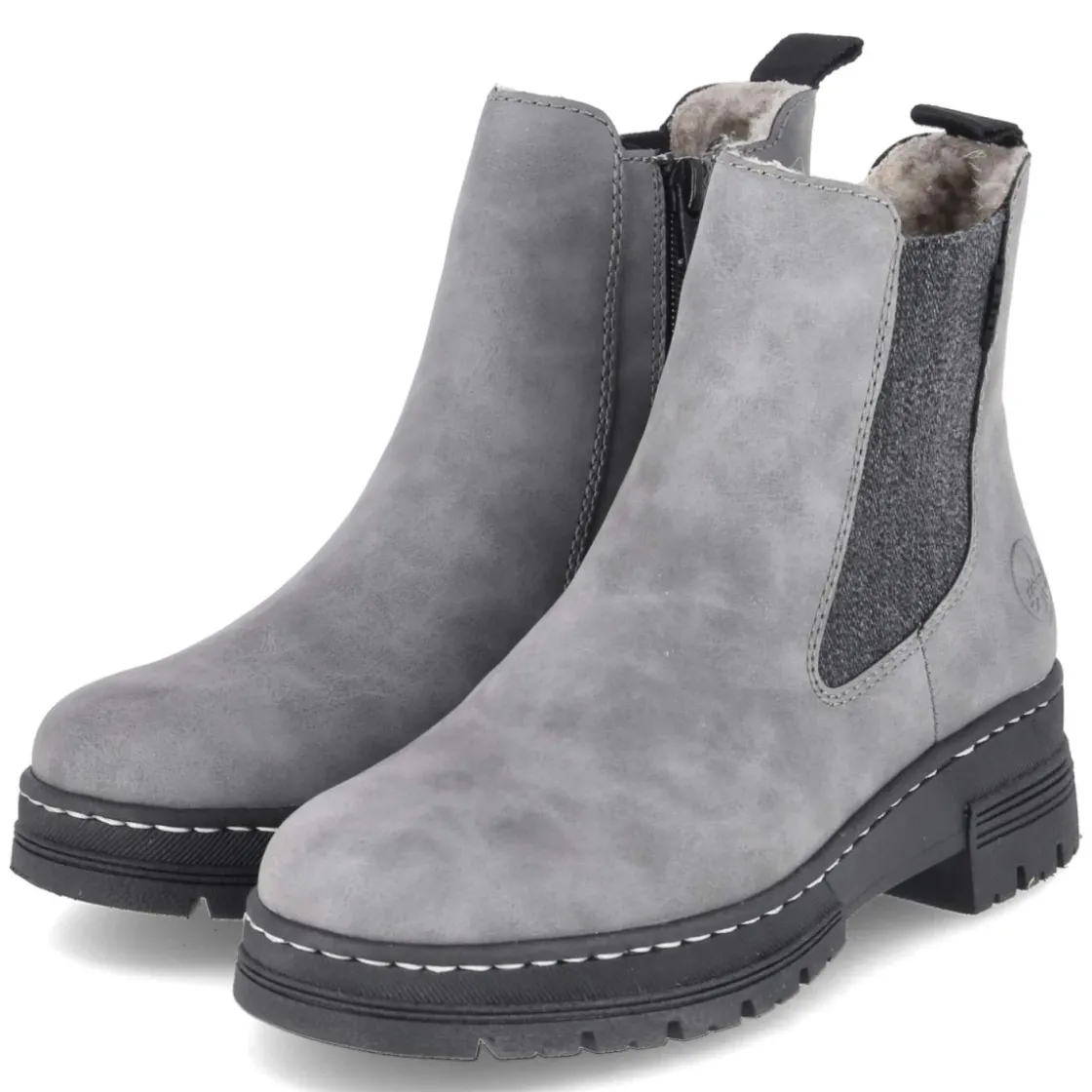 Diese grauen Chelsea Boots von Rieker verbinden wintertauglichen Komfort mit urbaner Leichtigkeit. Das pflegeleichte Obermaterial aus Synthetik schützt zuverlässig, während warmes Futter und die textile Decksohle für behagliche Temperaturen sorgen. Ein 4 cm hoher Blockabsatz bietet sicheren Stand, die runde Schuhspitze erhöht die Zehenfreiheit. Dank Reißverschluss, großer seitlicher Elastikeinsätze und Anziehlasche gelingt das Anziehen mühelos. Die flexible, rutschfeste Profilsohle hält souverän die Spur, das Wechselfußbett schafft Spielraum für individuelle Einlagen. Der Schuh fällt normal aus und bleibt als relaxtes Leichtgewicht auch an langen Tagen angenehm zu tragen. In zeitlosem Grau lässt sich das Modell vielseitig kombinieren – ob zum Casual-Look oder zum Büro-Outfit. Modetipp: Besonders stimmig wirkt der Boot zu dunkel gewaschener Slim-Jeans, Feinstrick-Rolli und einem wolligen Camelcoat.