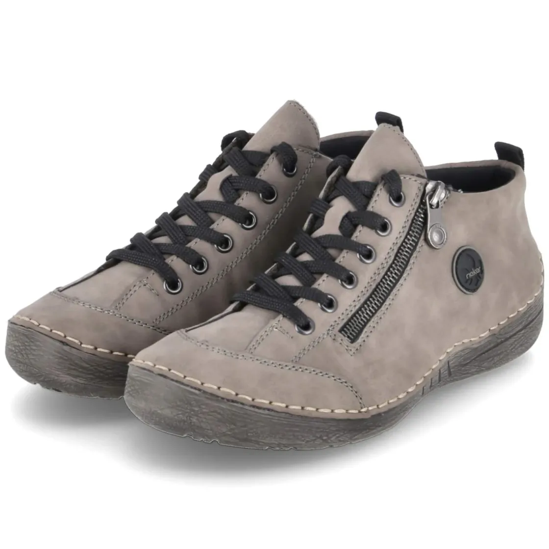 Der graue Rieker Halbschuh vereint lässige Alltagstauglichkeit mit durchdachtem Komfort. Das pflegeleichte Obermaterial aus Synthetik zeigt eine dezente Struktur, die dem Ton-in-Ton-Design Tiefe verleiht. Eine runde Schuhspitze betont den entspannten Charakter, während die Decksohle aus Textil und das leichte Warmfutter für angenehmes Klima an kühlen Tagen sorgen. Praktisch wird es dank der Kombination aus Schnürung und zusätzlichem Reißverschluss, die ein schnelles An- und Ausziehen ermöglicht, ohne auf einen sicheren Sitz zu verzichten. Der Schnitt fällt normal aus und gibt genügend Raum für bequemen Auftritt. Ideal im urbanen Alltag, auf dem Weg ins Büro oder beim entspannten Stadtbummel. Modetipp: Zu geraden Jeans, einem Feinstrickpullover und einem grauen Wollmantel entsteht ein harmonisch tonaler Look mit moderner Ruhe.