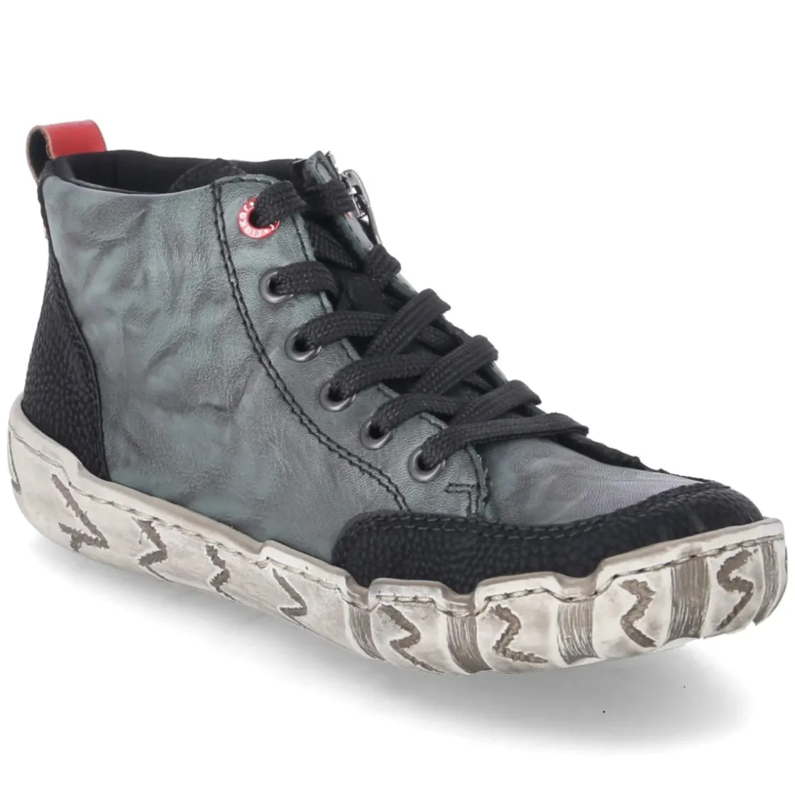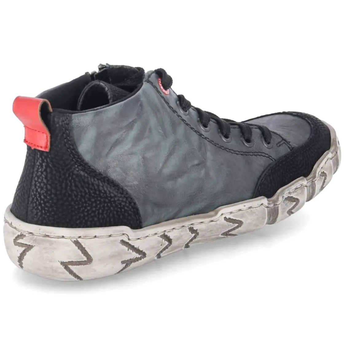 Der Rieker Halbschuh für Damen verbindet urbanen Used-Look in frischem Grün mit funktionalen Details. Der robuste Material-Mix aus Leder und Synthetik zeigt dezente schwarze und rote Elemente, während die runde Schuhspitze und der verstärkte Zehen- und Fersenbereich ein Plus an Schutz bieten. Schnürsenkel und seitlicher Reißverschluss ermöglichen schnelles An- und Ausziehen bei individuell einstellbarem Halt. Innen sorgt eine textile Decksohle für angenehmes Fußklima, die flexible, rutschfeste Laufsohle gibt verlässlichen Grip. Als relaxtes Leichtgewicht eignet sich das Modell ideal für den Alltag und fällt der Größe nach normal aus. Modetipp: Besonders stimmig zu Cropped-Jeans und Overshirt; Accessoires in Rot greifen die Details auf.