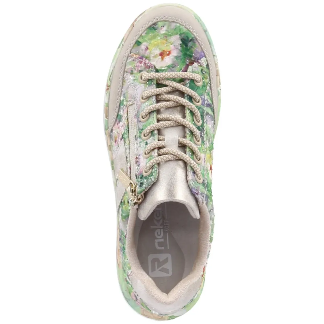 Der Low Sneaker von Rieker für Damen verbindet modernen Material-Mix aus Textil und Synthetik mit einem ausdrucksstarken Look. Die strukturierte Oberfläche trägt einen mehrfarbigen Blumen-Aquarell-Print, feinen Glitzer und goldene Details, während der verstärkte Zehenbereich die Alltagstauglichkeit erhöht. Dank rundem Leisten, komfortablem Wechselfußbett mit Textil-Decksohle und einer rutschfesten Laufsohle gelingen lange Tage entspannt. Schnürsenkel sorgen für variablen Halt, der zusätzliche Reißverschluss für bequemen Einstieg. Der 4 cm hohe Plateau-Absatz setzt einen leichten Lift, ohne die Stabilität zu mindern. Das Muster wirkt lebendig und bleibt durch die gedeckten Goldakzente elegant. Größenhinweis: fällt normal aus. Modetipp: Besonders stimmig wirkt das Modell zu cropped Jeans in Mid-Blue und einer leichten Bluse; ein goldener Armreif greift die Details auf und rundet das Ensemble harmonisch ab.