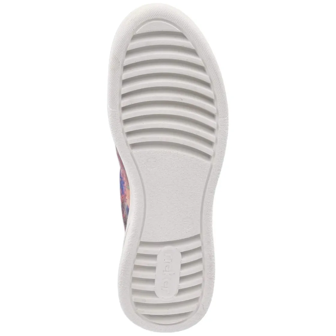 Der Low Sneaker von Rieker verbindet frische Optik und Komfort in einer alltagstauglichen Silhouette. Das pflegeleichte Obermaterial aus Synthetik zeigt einen bedruckten, tropischen Blätterprint auf zartem Rosa und setzt damit sommerliche Akzente. Die runde Schuhspitze und der gepolsterte Einstieg sorgen für ein angenehmes Tragegefühl, während die hautfreundliche Lederdecksohle mit gepolstertem Lederfußbett sanft abfedert. Praktisch: Schnürsenkel für den individuellen Sitz, ergänzt durch einen zusätzlichen Reißverschluss für schnelles An- und Ausziehen. Die starke Cupsohle mit Sichtfenster im Fersenbereich verleiht dem Modell eine sportliche Note und zuverlässigen Halt. Der Damen-Sneaker fällt normal aus und lässt sich mühelos in den Alltag integrieren. Modetipp: Besonders stimmig zu hellen Mom-Jeans, weißem T-Shirt und einem naturfarbenen Leinen-Blazer, der den Print edel wirken lässt.