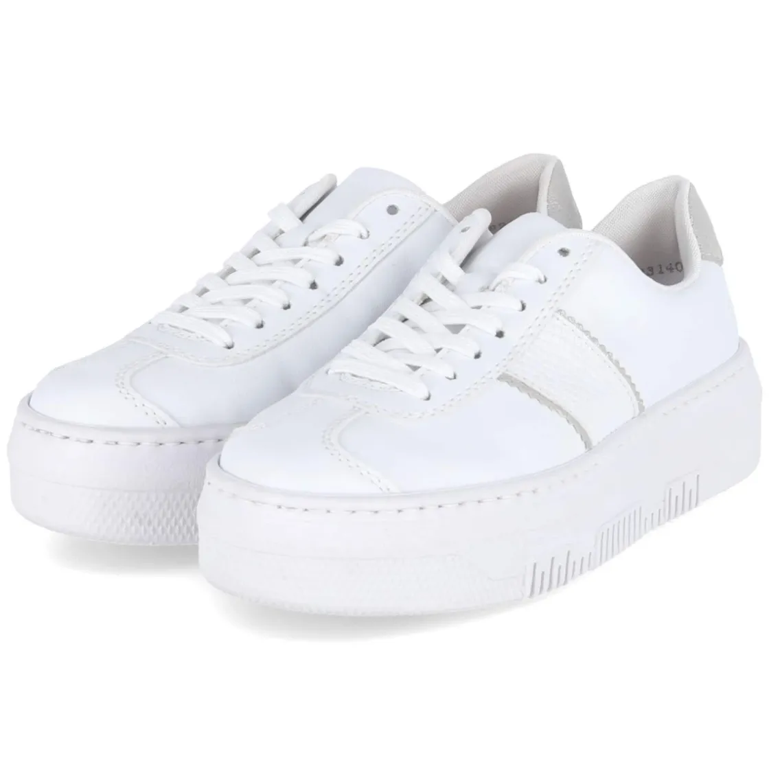 Der Low Sneaker von Rieker setzt auf cleanes Weiß und ein moderates Plateau von 4 cm, das subtil Höhe schenkt und den Look modern abrundet. Das pflegeleichte Synthetik-Obermaterial zeigt dezente Glitzerdetails und einen Zierstreifen mit feiner Reptilprägung, während Branding-Elemente den sportiven Charakter unterstreichen. Eine runde Spitze, verstärkte Zehen- und Fersenpartie sowie ein gepolsterter Einstieg sorgen für Komfort im Alltag. Das relaxt leichte Tragegefühl wird durch eine rutschhemmende Laufsohle und ein weich gepolstertes, hautfreundliches Lederfußbett unterstützt. Mit Schnürsenkeln individuell anpassbar und größengetreu – fällt normal aus. Modetipp: Besonders stilvoll zu Cropped-Jeans und einer weißen Hemdbluse oder als cleaner Kontrast zu einem fließenden Midikleid.