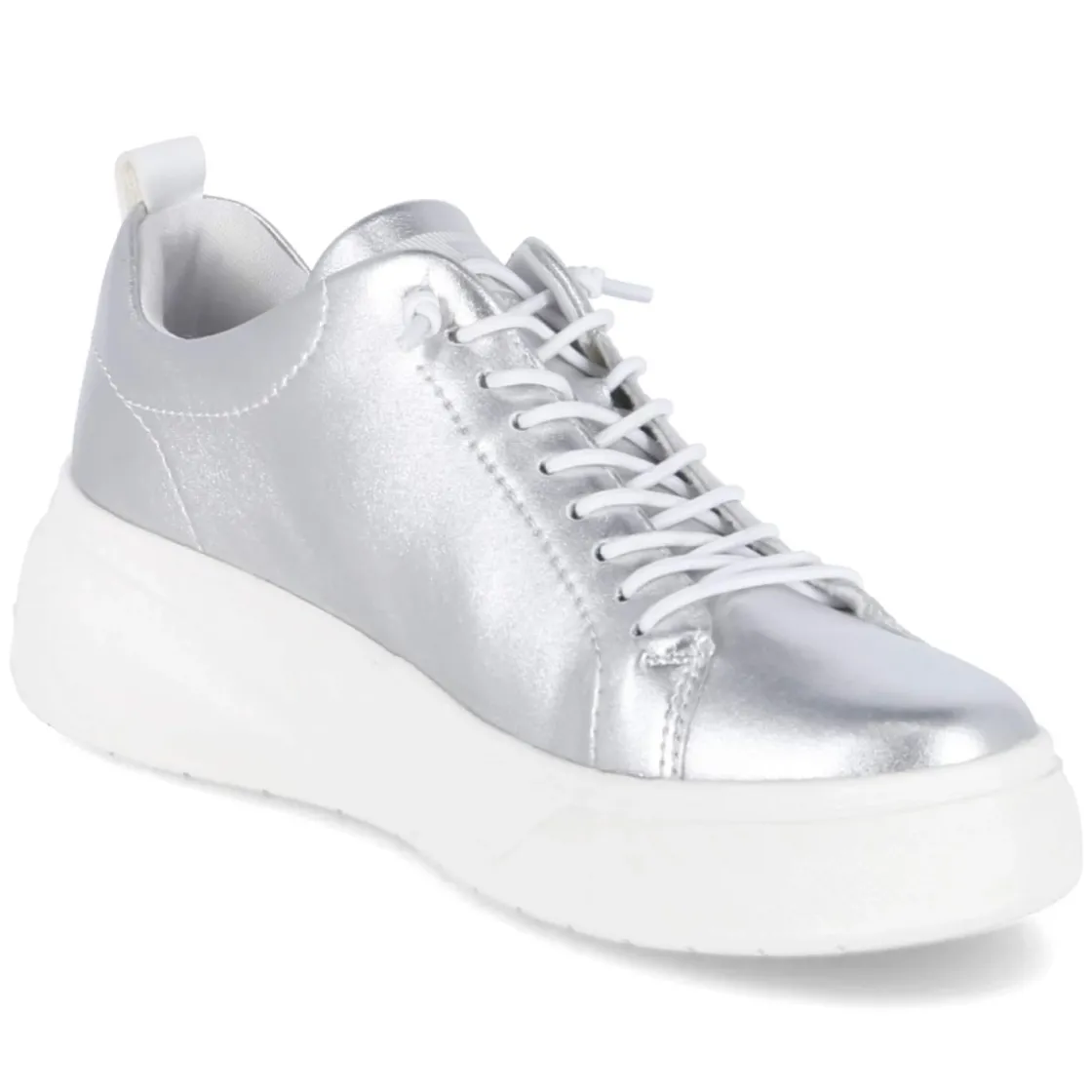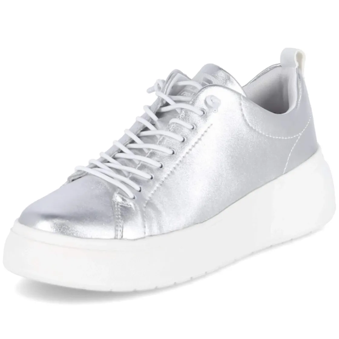 Der Low Sneaker von Rieker verbindet edlen Glanz mit Alltagstauglichkeit. Das Obermaterial aus Glattleder zeigt eine elegant schimmernde Oberfläche mit metallischem Finish, während Plateau und runde Schuhspitze dem Look moderne Leichtigkeit geben. Eine rutschhemmende Laufsohle mit 4 cm Plateau sorgt für sicheren Tritt, der verstärkte Fersenbereich und der gepolsterte Einstieg erhöhen den Komfort. Das gepolsterte Wechselfußbett mit Textil-Decksohle lässt sich individuell austauschen, die bequeme Elastikschnürung und klassische Schnürsenkel erleichtern das An- und Ausziehen. Der Sneaker ist gelabelt und fällt normal aus, ideal für Damen in der Zielgruppe Erwachsene. Modetipp: Den silbernen, metallisch glänzenden Ton mit cleanen Monochrom-Looks in Weiß oder Grau kombinieren, dazu eine weite Anzughose und ein feines Stricktop für eine elegante, urbane Note.
