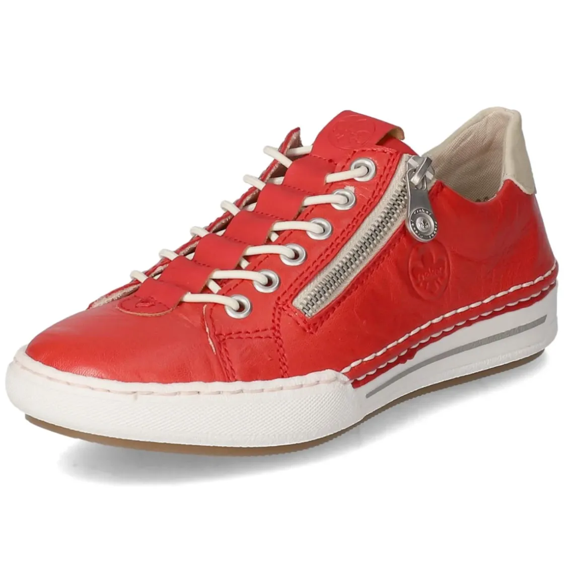 Der Low Sneaker von Rieker in leuchtendem Rot verbindet sportliche Leichtigkeit mit alltagstauglichem Komfort. Ein moderner Material-Mix aus Leder und Synthetik unterstreicht die dynamische Linienführung, während die runde Spitze und die verstärkte Ferse ein angenehmes Tragegefühl geben. Der weich gepolsterte Einstieg und die gepolsterte, herausnehmbare Decksohle aus Textil unterstützen lange Tage auf den Beinen. Praktisch und stilvoll: Schnürung mit elastischen Bändern und zusätzlicher seitlicher Reißverschluss erlauben schnelles An- und Ausziehen und individuellen Halt. Die flexible, rutschhemmende Laufsohle sorgt für verlässlichen Grip im urbanen Alltag. Passform fällt normal aus und richtet sich an Damen. Modetipp: Den kräftigen Rotton mit Creme, Navy oder Denim kombinieren und mit einer schlichten Crossbody-Bag akzentuieren.