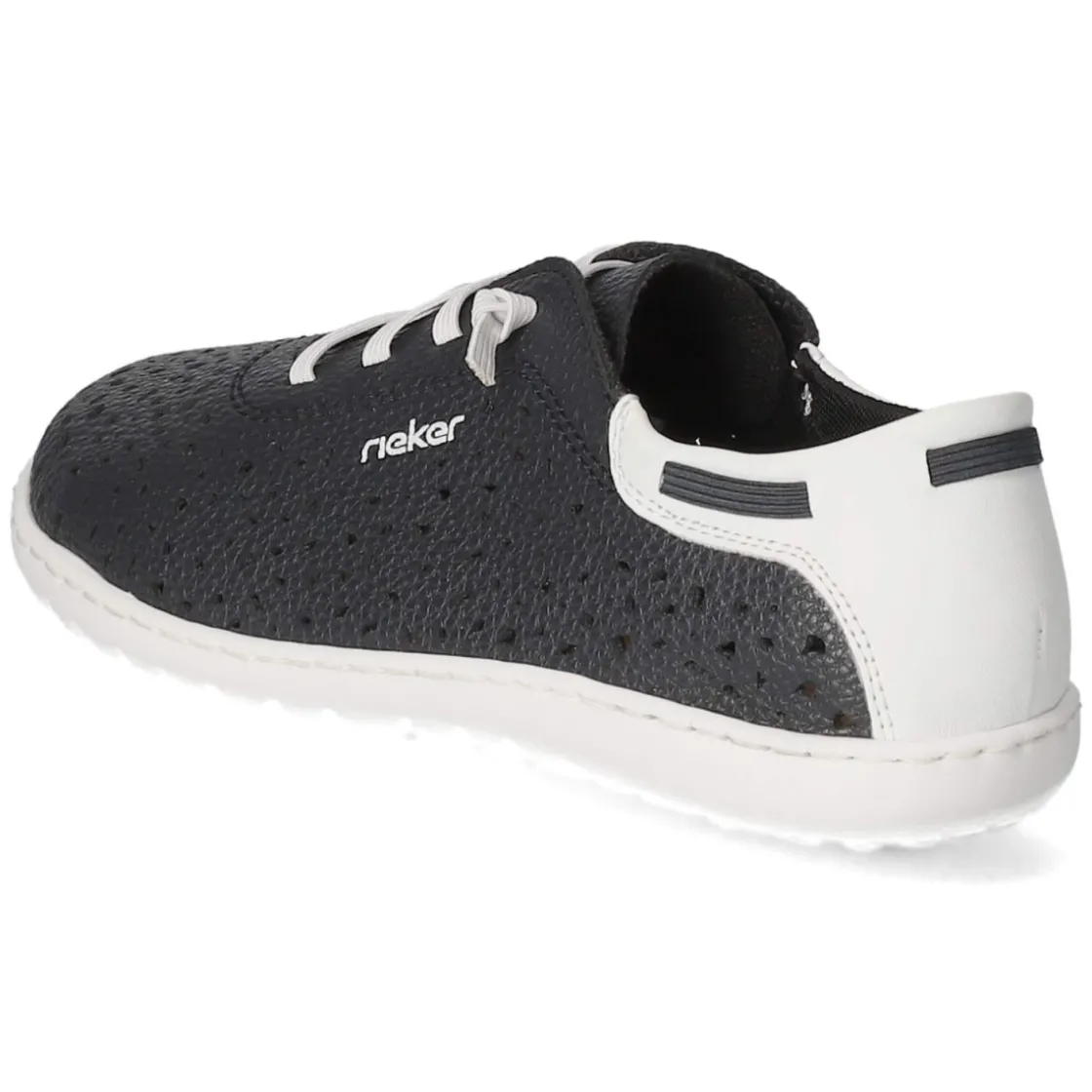 Der Low Sneaker von Rieker in Blau verbindet sportliche Lässigkeit mit einem frischen, urbanen Auftritt. Die modern designte Synthetik mit gelochter Oberfläche sorgt für angenehme Luftzirkulation, während die runde Schuhspitze und die verstärkte Ferse ein ausgewogenes Tragegefühl bieten. Dank Schnürsenkeln und zusätzlichem Elastikband gelingt der unkomplizierte Einstieg, die Passform lässt sich zugleich variabel anpassen. Innen verwöhnt ein angenehmes Textilfutter, die textile Decksohle und ein gepolstertes Fußbett federn jeden Schritt weich ab. Die flexible, rutschhemmende Laufsohle gibt Halt im Alltag, beim Bummel oder auf dem Weg ins Office. Der Größenhinweis fällt normal aus. Dezente Markendetails unterstreichen den cleanen Look. Modetipp: besonders stimmig zu hellen Mom-Jeans, einer gestreiften Bluse und Trenchcoat für einen maritimen City-Style.