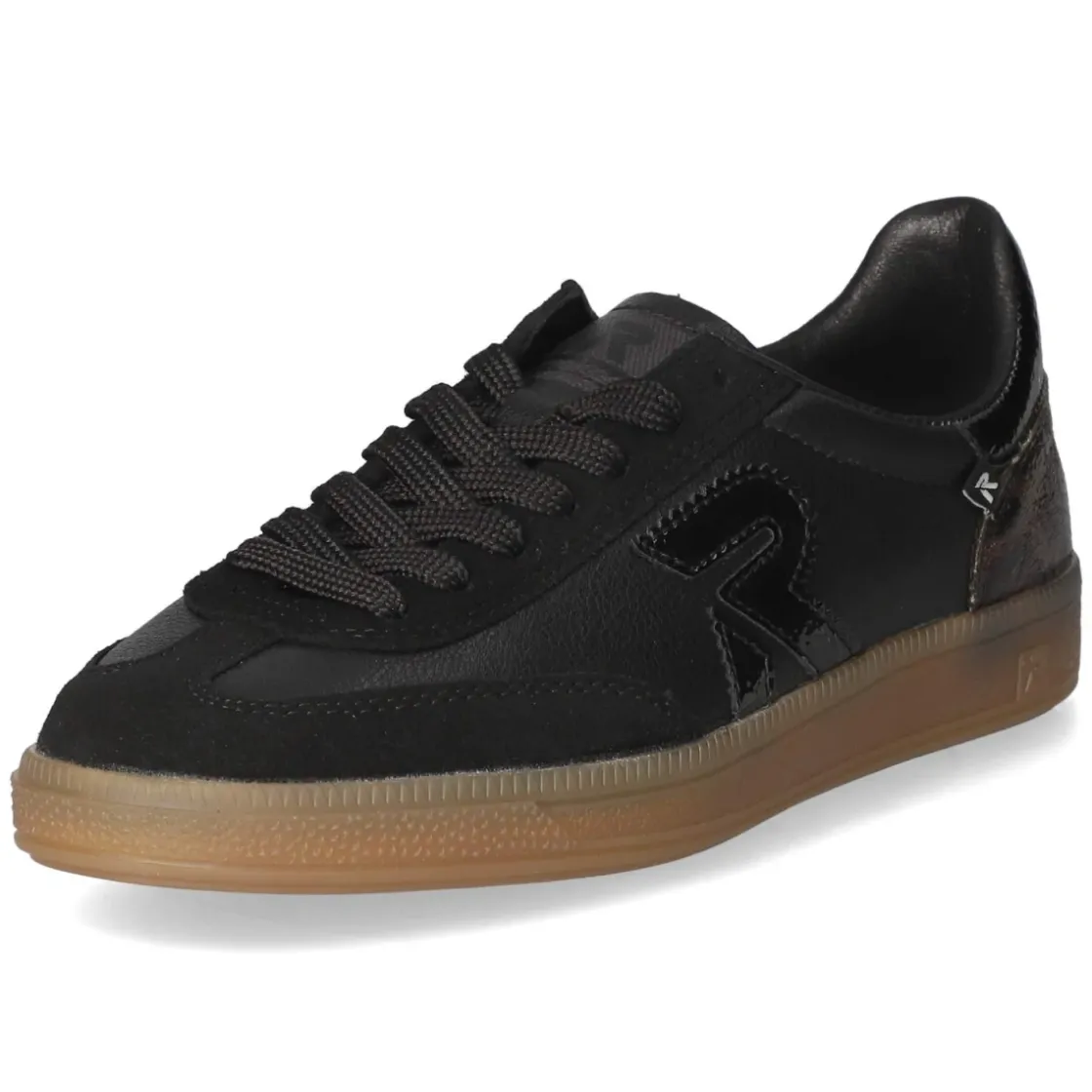 Der Low Sneaker von Rieker vereint feminine Lässigkeit mit durchdachtem Komfort. Atmungsaktives Echtleder schmiegt sich angenehm an den Fuß, die runde Spitze bietet entspannt Platz und der verstärkte Zehen- und Fersenbereich sorgt für Formstabilität im Alltag. Die variable Schnürung ermöglicht eine individuelle Anpassung, während das komfortable, herausnehmbare Wechselfußbett mit textiler Oberfläche den Schritt weich abfedert und sich bei Bedarf austauschen lässt. In klassischem Schwarz bekommt das Modell durch Partien aus Rauleder, glänzendem Lackleder und dezentem Animalprint eine modische Tiefe, die den Look vielseitig macht. Markendetails setzen subtile Akzente. Der Damen-Sneaker fällt größengetreu aus und passt zu vielen Anlässen von Office bis Freizeit. Modetipp: Besonders stimmig wirkt das Design zu Cropped-Jeans und einem strukturierten Blazer.