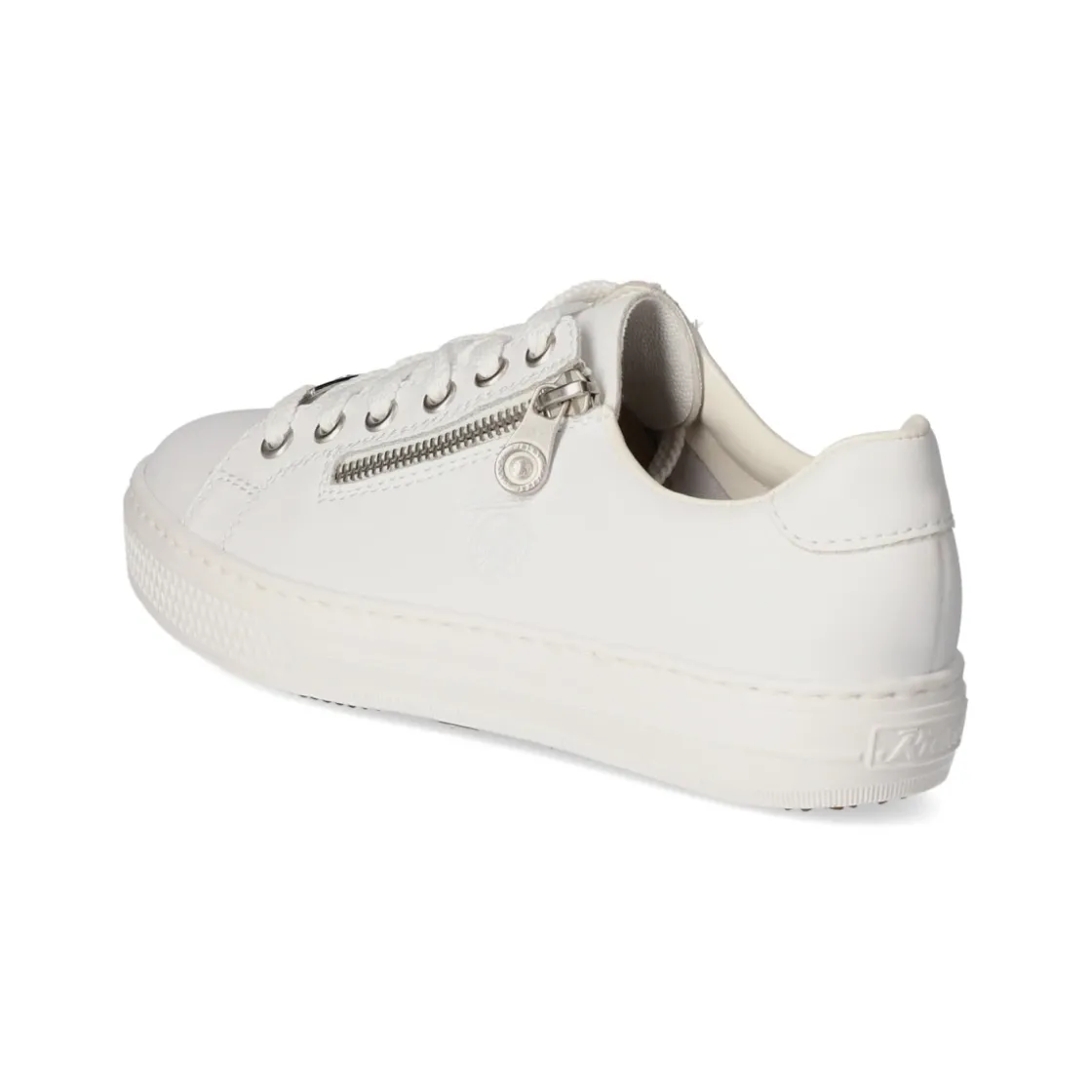 Zeitloser City-Style trifft Komfort: Der weiße Low Sneaker von Rieker aus langlebigem Echtleder überzeugt mit klarer Linienführung und rund gearbeiteter Spitze. Das Obermaterial aus Glattleder verleiht eine gepflegte Optik, während die textile Decksohle für angenehmes Fußklima sorgt. Die beste Memory-Foam-Fußbettung federt Schritte weich ab und bleibt auch an langen Tagen komfortabel. Praktisch im Alltag: Schnürsenkel für individuellen Halt und ein zusätzlicher Reißverschluss für schnelles An- und Ausziehen. Die flexible, rutschhemmende Cupsohle liefert Grip und unterstreicht den cleanen Look. Hinweis zur Passform: fällt kleiner aus, daher empfiehlt sich die Wahl einer Nummer größer. Modetipp: Mit Cropped-Jeans, weißem T-Shirt und beigem Trench entsteht ein moderner Monochrom-Look, der den puristischen Auftritt des Sneakers betont.
