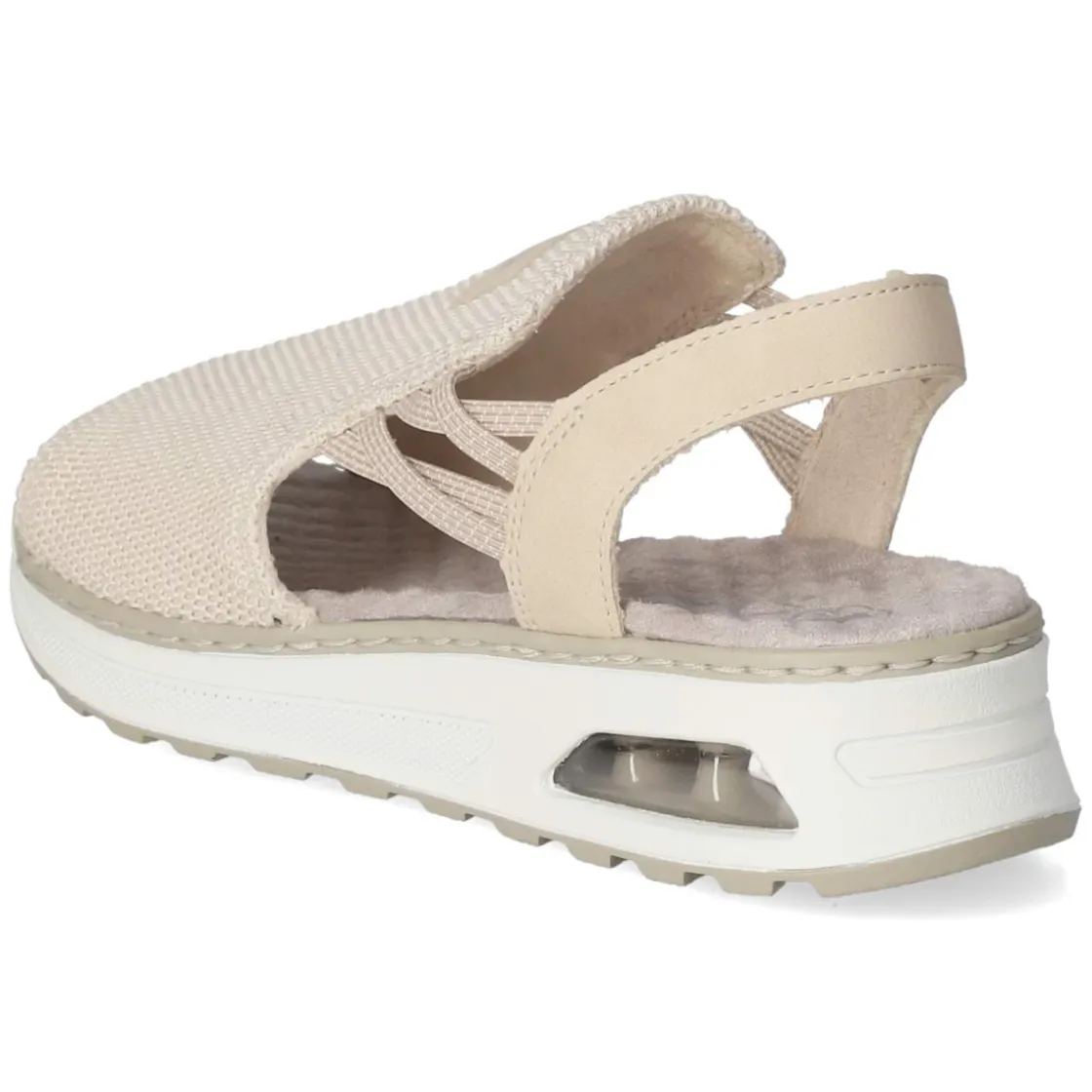 Rieker präsentiert eine leichte Damen-Sandale in zartem Beige, die durch einen angenehmen Textil‑Synthetik‑Mix und eine offene Schuhspitze sommerliche Leichtigkeit ausstrahlt. Seitliche Elastikbänder sorgen für bequemen Einstieg ohne Verschluss und halten den Fuß sicher. Ein weich gepolstertes Fußbett und die sanft gepolsterte Ferse erhöhen den Tragekomfort im Alltag, während atmungsaktive Mesh-Elemente und glänzende Akzente den sympathischen Look modern akzentuieren. Die flexible, rutschhemmende Laufsohle mit Sichtfenster bietet zuverlässigen Grip auf unterschiedlichen Untergründen. Mit normal ausfallender Passform und textiler Decksohle wird ein bequemes Tragegefühl geboten, das zu vielen Outfits passt. Modetipp: Zu luftigen Leinenhosen und einer fließenden Bluse entsteht ein entspannt-eleganter Sommer-Look, den Accessoires in Goldtönen stimmig abrunden.