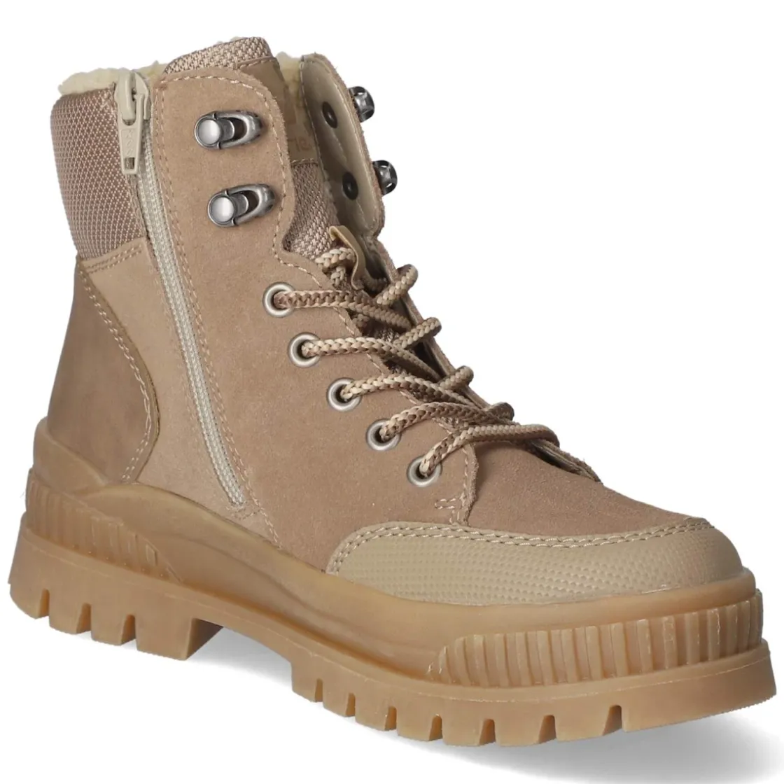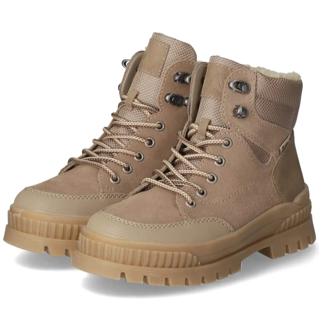Diese beige Damen-Schnürstiefeletten von Rieker vereinen alltagstaugliche Robustheit mit behaglichem Tragegefühl. Das synthetische Obermaterial mit TEX-Ausstattung hält Feuchtigkeit zuverlässig ab und bleibt zugleich atmungsaktiv, während Warmfutter für ein angenehmes Klima an kühlen Tagen sorgt. Eine rund gearbeitete Spitze und die verstärkte Zehen- und Fersenpartie bieten Schutz und Stabilität, die rutschfeste Profilsohle überzeugt auf glatten Wegen. Praktisch ist der Mix aus Schnürsenkeln und seitlichem Reißverschluss, der das An- und Ausziehen erleichtert. Die textile Decksohle liegt weich am Fuß, das Wechselfußbett lässt Raum für eigene Einlagen. Mit gestepptem Schaftrand und dezenten Markendetails fügt sich das Modell vielseitig in Damen-Garderoben ein und fällt größengetreu aus. Modetipp: In Kombination mit Wollmantel, Strickkleid und blickdichter Strumpfhose entsteht ein stilvoller City-Look in warmen Naturtönen.