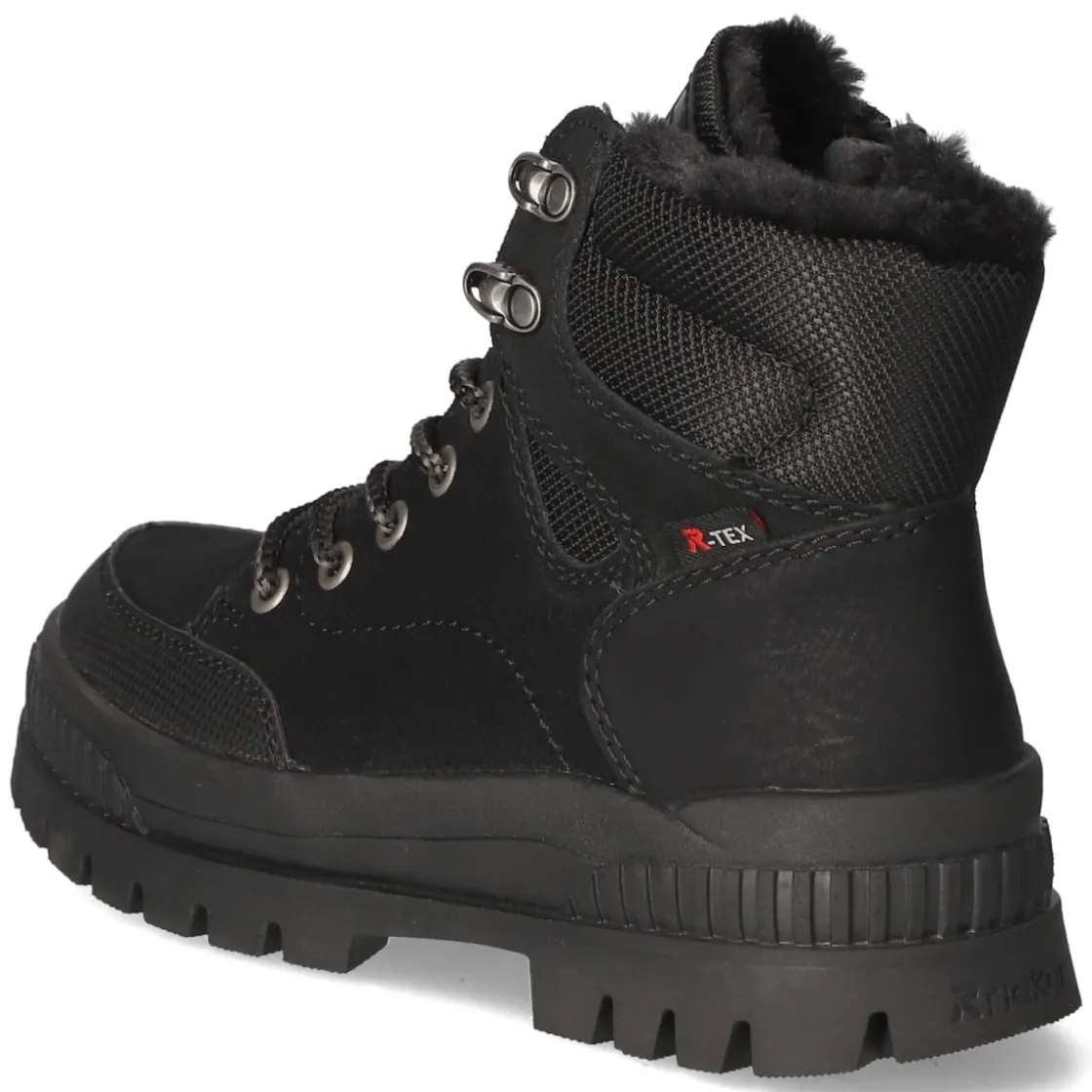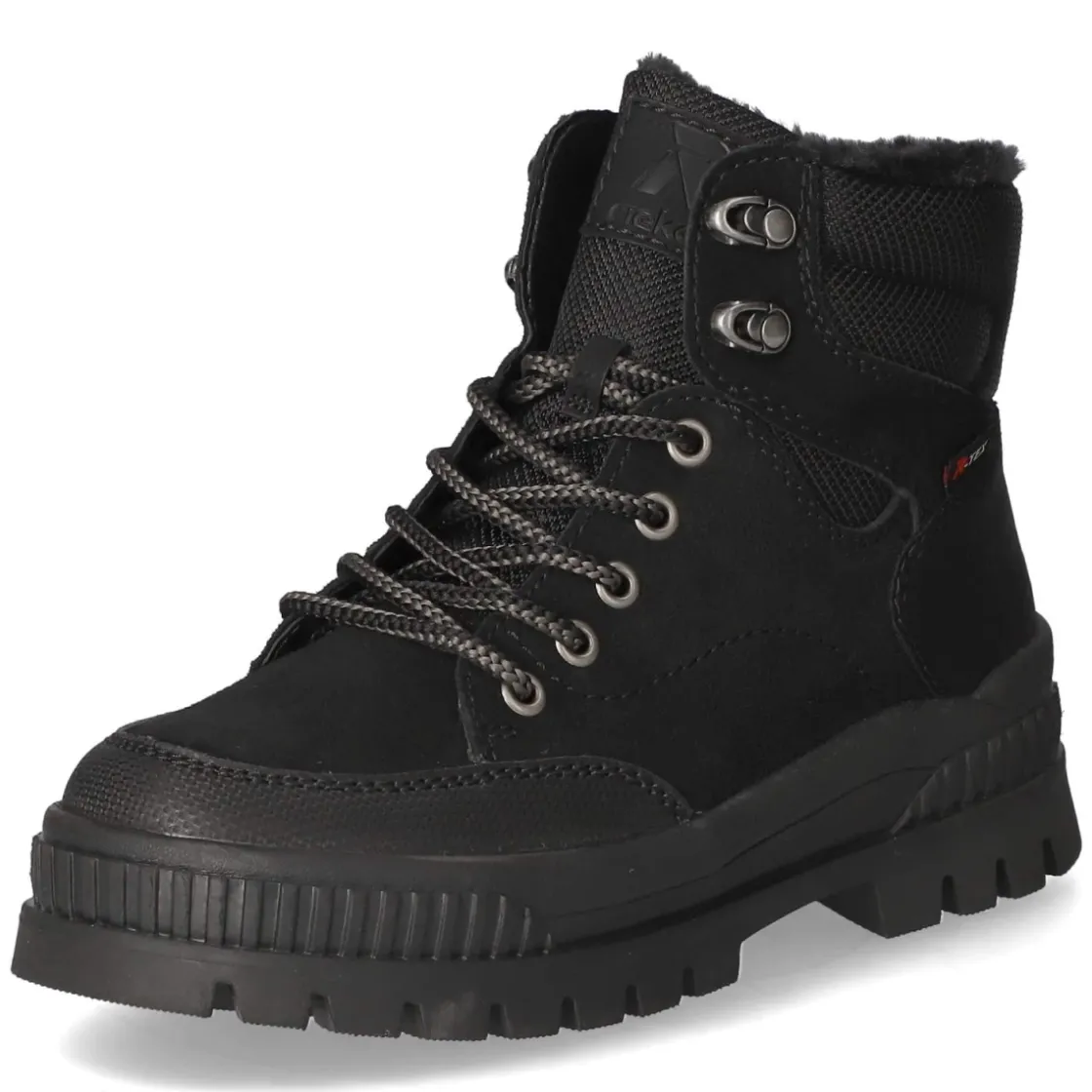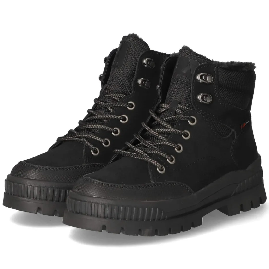 Diese Rieker Schnürstiefeletten für Damen verbinden einen modernen Material-Mix aus Leder und Synthetik mit durchdachter Funktion für kalte Tage. Das warme Futter und die wasserabweisende TEX-Ausstattung schützen bei winterlichem Wetter, während die textile Decksohle und das herausnehmbare Fußbett für angenehmen Tragekomfort sorgen. Die runde Schuhspitze lässt den Zehen Raum, der verstärkte Zehen- und Fersenbereich erhöht die Langlebigkeit. Schnürsenkel in Kombination mit seitlichem Reißverschluss erleichtern den Einstieg und sichern den Halt. Die flexible, rutschfeste Profilsohle gibt Trittsicherheit auf nassem Asphalt. In klassischem Schwarz und mit normal ausfallender Passform entsteht ein Look für den perfekten Auftritt zwischen Alltag und Anlass. Modetipp: Zu schmaler Denim, feinem Rollkragen und einem strukturierten Wollmantel entsteht ein clean-urbanes Ensemble.