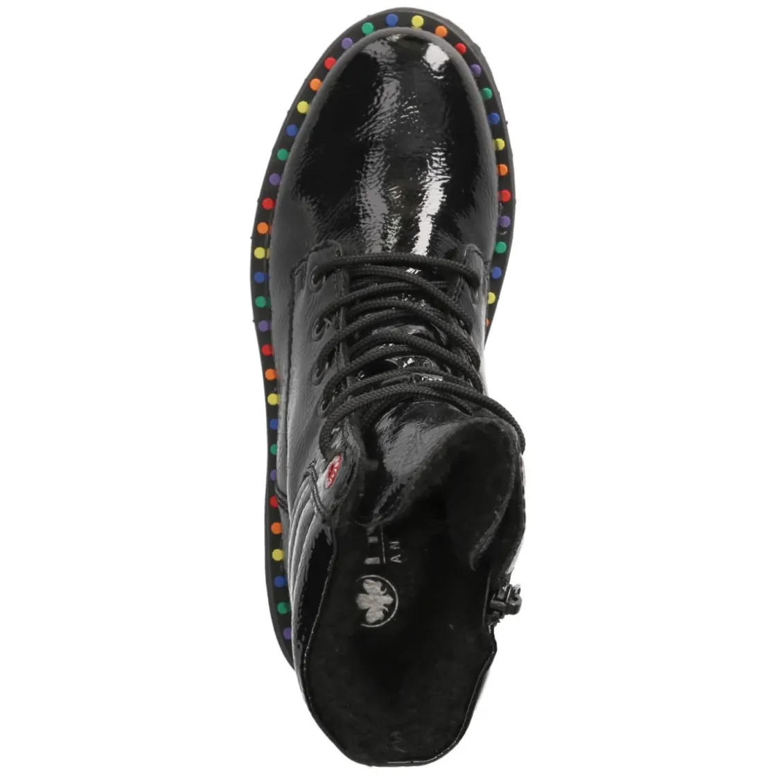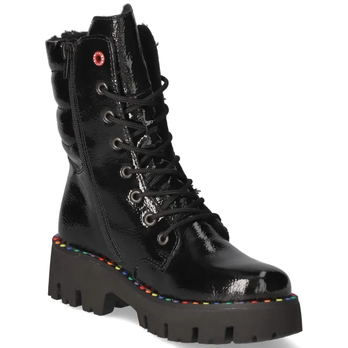 Diese Rieker Schnürstiefeletten vereinen eine elegante Lackoptik mit funktionalen Details für die kalte Saison. Das Obermaterial in tiefem Schwarz bringt Glanz in den Look, während die runde Schuhspitze und die angenehm gepolsterte Textildecksohle komfortable Schritte ermöglichen. Ein 5 cm hoher Plateauabsatz verleiht subtilen Höhengewinn und sorgt für einen modernen Auftritt. Das warme Futter umhüllt zuverlässig an kühlen Tagen, der praktische Mix aus Schnürsenkeln und seitlichem Reißverschluss erleichtert das An- und Ausziehen. Die Passform fällt normal aus und eignet sich für vielfältige Anlässe – von City-Styles bis zu besonderen Events. Modetipp: In Kombination mit einer blickdichten Strumpfhose, einem Midirock aus Satin und einem strukturierten Strickpullover entsteht ein spannender Kontrast zwischen Glanz und Weichheit, der das edle Finish der Stiefelette betont.