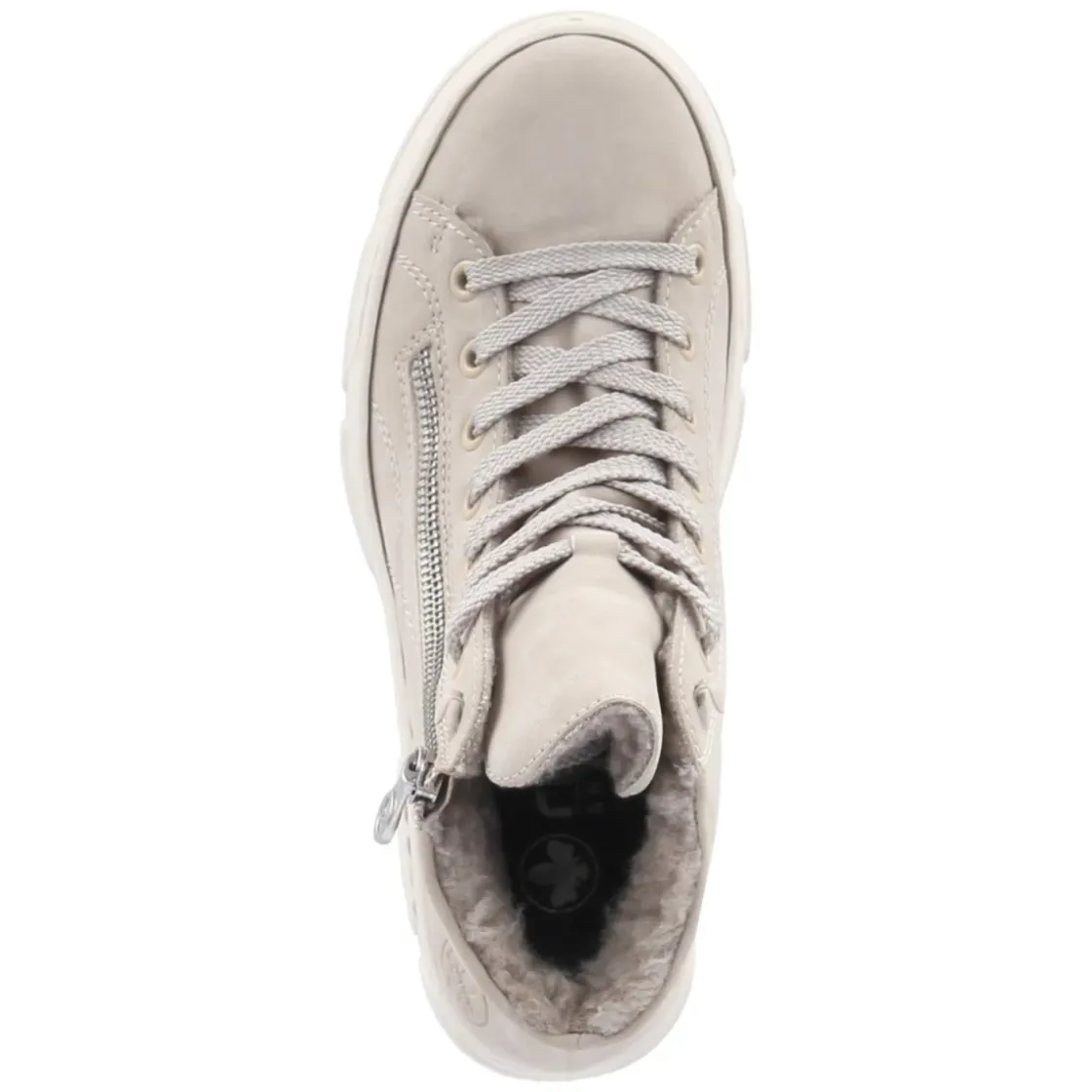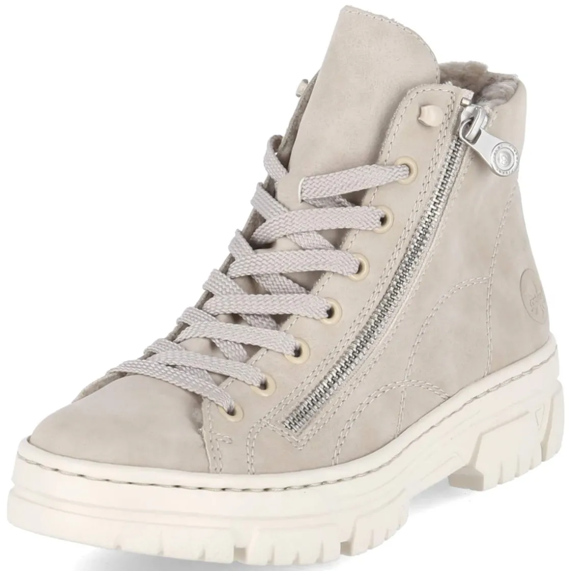 Die Damen-Schnürstiefeletten von Rieker kombinieren einen cleanen Look mit einer starken Laufsohle und sind damit ein zuverlässiger Begleiter für kühle Tage. Das pflegeleichte Obermaterial aus Kunstleder in softem Beige harmoniert mit dem warmen Futter, während die runde Spitze ein komfortables Tragegefühl unterstützt. Praktisch: Schnürsenkel für individuelle Anpassung und seitlicher Reißverschluss für schnelles An- und Ausziehen. Das herausnehmbare Wechselfußbett und das relaxt leichte Tragegefühl sorgen auch an langen Tagen für Komfort. Die Passform fällt normal aus und bietet vielseitige Kombinationsmöglichkeiten von Casual bis Smart-Casual. Modetipp: Zu einem cremefarbenen Strickkleid und blickdichten Strumpfhosen tragen, darüber ein Oversize-Wollmantel in Kamel – so wirkt Beige modern und wintertauglich.