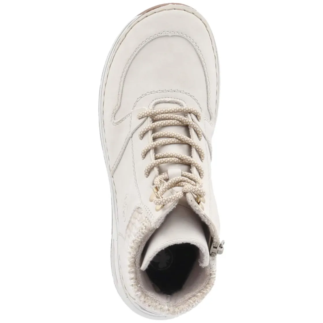 Diese Damen-Schnürstiefeletten von Rieker vereinen sportliche Lässigkeit und durchdachten Komfort in einem vielseitigen Allrounder. Das beige Synthetik-Obermaterial zeigt sich pflegeleicht und formstabil, während der gepolsterte Strick-Einstieg sanft um den Knöchel schmiegt. Eine weiche Textil-Decksohle sorgt fürs Fußwohl und macht das relaxt leichte Modell zum idealen Begleiter für lange Tage. Schnürung und seitlicher Reißverschluss ermöglichen einen unkomplizierten Einstieg und eine passgenaue Fixierung. Dezente goldene Highlights setzen feminine Akzente, die runde Spitze und der verstärkte Fersen- und Zehenbereich bieten Schutz und Komfort. Der Schnitt fällt normal aus und überzeugt in Alltag wie Freizeit mit angenehmer Flexibilität. Modetipp: Mit Cropped-Jeans, feinem Strickpullover und einem Wollmantel entsteht ein urbaner Look, der die goldenen Details elegant aufgreift.