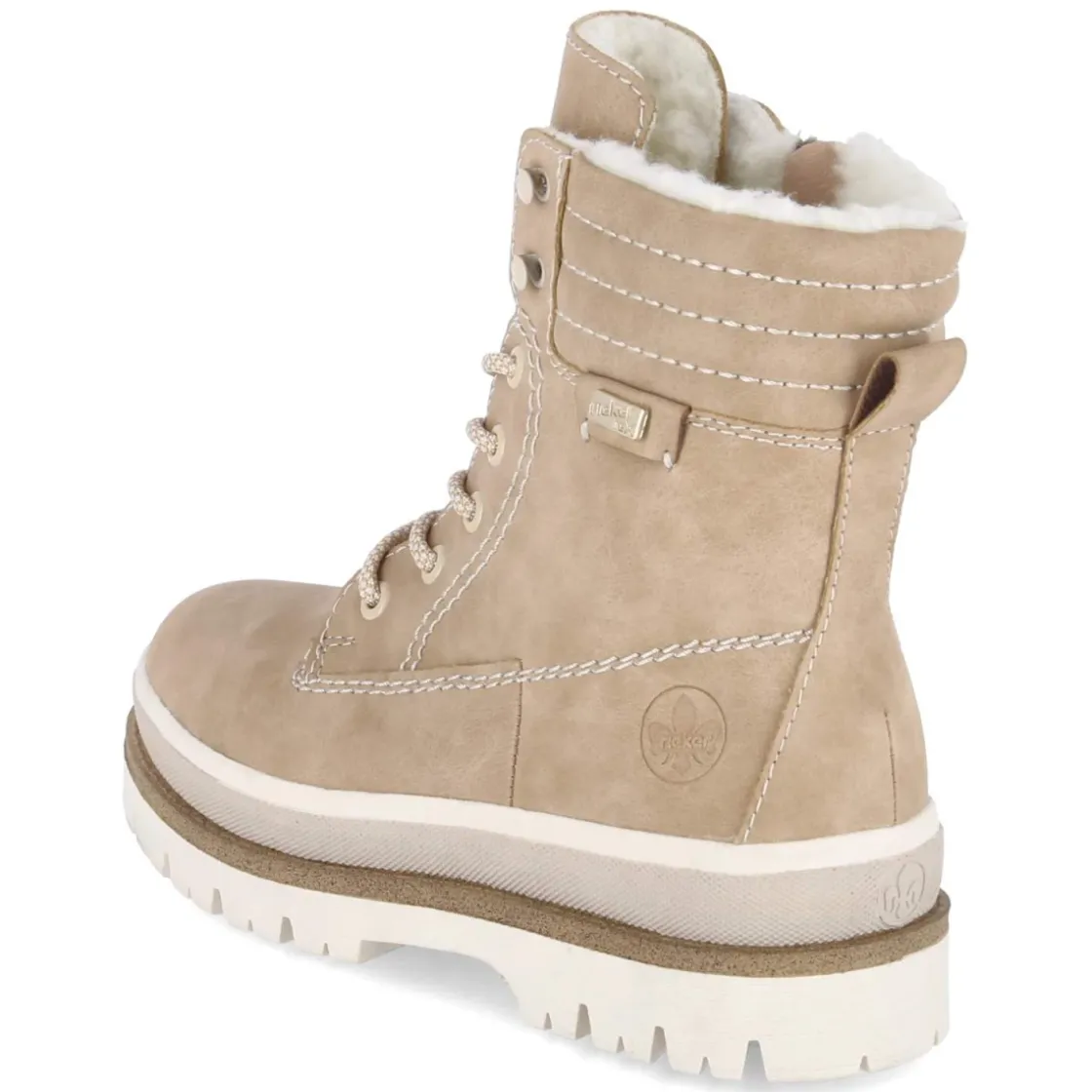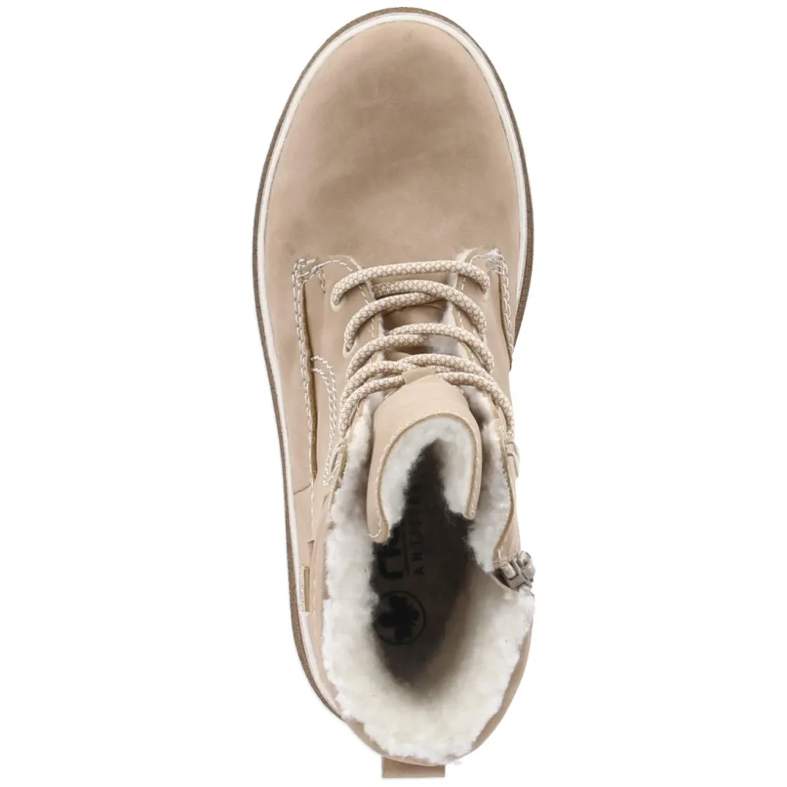 Diese beige Schnürstiefeletten von Rieker verbinden wintertauglichen Komfort mit zeitlosem Design. Das robuste Obermaterial aus Kunstleder, die runde Spitze und ein 4 cm hoher Blockabsatz sorgen für angenehme Stabilität im Alltag. Warmfutter und atmungsaktive Verarbeitung halten die Füße an kalten Tagen angenehm temperiert, während die wasserfesten, wasserabweisenden Eigenschaften Schutz bei nassem Wetter bieten. Schnürsenkel und seitlicher Reißverschluss erleichtern den Einstieg, unterstützt von Anziehlasche und gepolstertem Schaft in markanter Querstepp-Optik. Ein weich gepolstertes, herausnehmbares Fußbett und die flexible, rutschhemmende Profilsohle mit verstärktem Fußrahmen erhöhen den Laufkomfort. Weiße Ziernähte setzen dezente Akzente. Der Schuh fällt normal aus und lässt sich vielfältig kombinieren. Modetipp: Ton-in-Ton mit Wollmantel in Sand und groben Stricksocken stylen, für einen modernen City-Look.