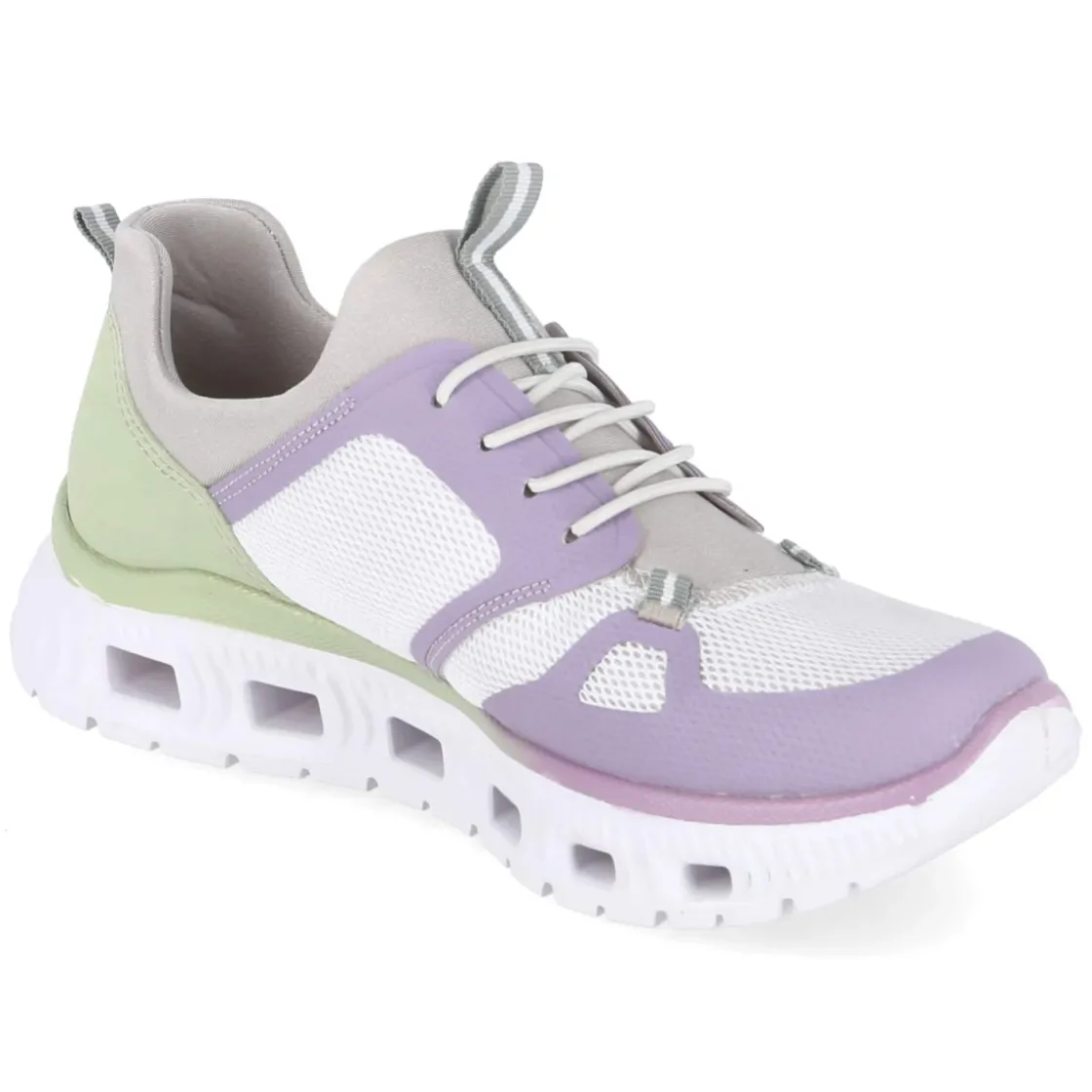 Dieser Slip-On-Sneaker von Rieker verbindet moderne Optik mit spürbarem Komfort. Das Obermaterial aus Textil und Synthetik zeigt eine markante Strick-Optik mit Mesh-Partien und frischen Akzenten in Weiß, Lila, Grün und Beige. Ohne Verschluss, mit Anziehlaschen und rund zulaufender Spitze gelingt der Einstieg mühelos. Die vegane Materialwahl überzeugt ebenso wie die beste Memory-Foam-Fußbettung, die sich weich an den Fuß schmiegt und nach jedem Schritt in Form bleibt. Verstärkte Zonen an Ferse und Zehen sorgen für Stabilität, während die flexible, rutschfeste Laufsohle mit Luftpolstern angenehm federt. Ein relaxtes Leichtgewicht für Alltag und Reise, das textile Innenleben unterstützt ein angenehm trockenes Tragegefühl. Modetipp: Mit weiter Anzughose in Creme, Ripptop und leichter Utility-Jacke entsteht ein urbanes Athleisure-Set, das die Farbakzente elegant aufnimmt.