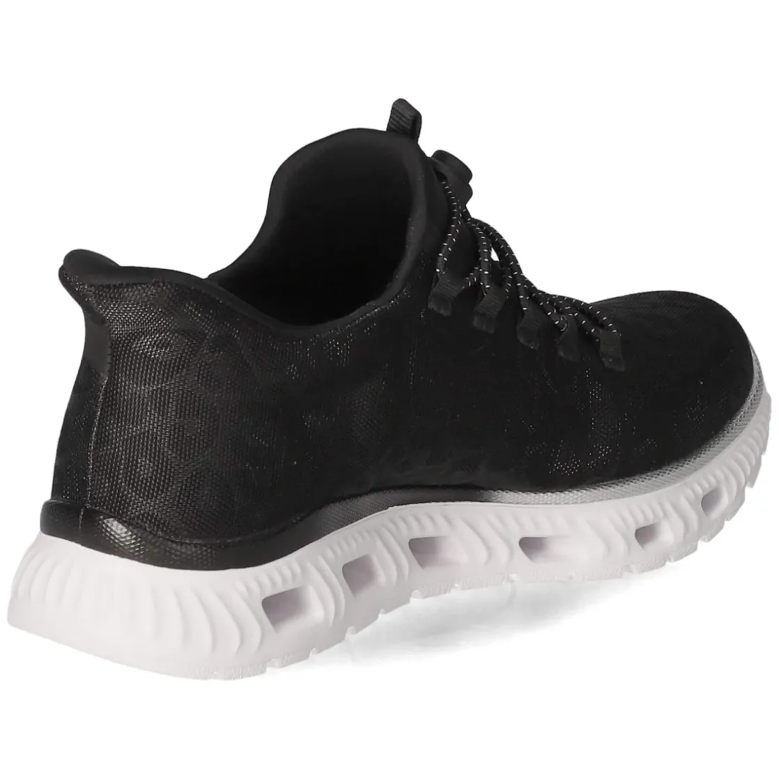 Der Slip on Sneaker von Rieker in tiefem Schwarz verbindet sportliche Leichtigkeit mit urbanem Chic. Das leichte Obermaterial aus Textil und Synthetik schmiegt sich angenehm an den Fuß, während die runde Schuhspitze und das gepolsterte Fußbett für entspanntes Tragegefühl im Alltag sorgen. Dank flexiblem Schnellverschluss und Anziehlasche gelingt das Hineinschlüpfen im Handumdrehen, die flexible, rutschhemmende Laufsohle liefert zuverlässigen Grip. Glänzende Akzente und eine dezente Animaloptik setzen subtile Highlights, Markendetails runden den Look ab. Die Passform fällt normal aus, die textile Decksohle erhöht den Komfort auch bei längeren Wegen. Ein vielseitiger Damen-Sneaker, der Büro, City und Freizeit mühelos verbindet. Modetipp: Mit verkürzter Straight-Jeans und Oversize-Blazer entsteht ein smarter Kontrast, monochrom in Schwarz mit silbernen Accessoires wirkt der Look besonders modern.