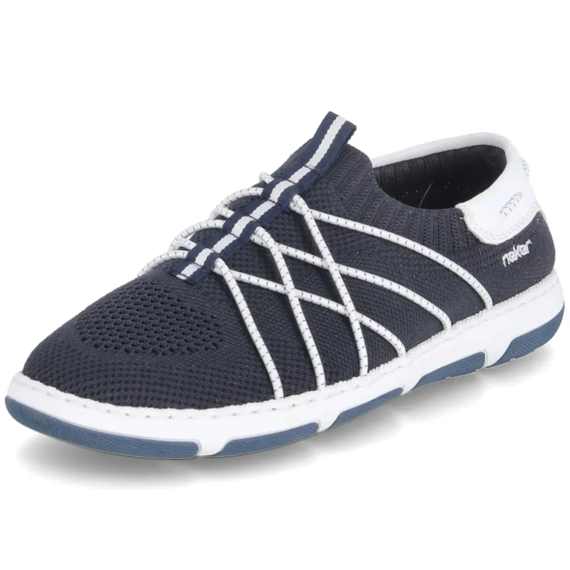 Der Rieker Slipper für Damen vereint sportliche Optik und modernen Material-Mix aus Textil und Synthetik in einem frischen Blauton. Elastikbänder über dem Spann und der stretchige Einstieg bieten bequemen Halt, während die verstärkte Ferse und die Anziehlasche das Hineinschlüpfen erleichtern. Das gepolsterte Wechselfußbett mit textiler Decksohle umhüllt den Fuß angenehm und lässt sich bei Bedarf gegen eigene Einlagen tauschen. Eine flexible, rutschhemmende Laufsohle sorgt für sicheren Grip im Alltag, die runde Schuhspitze schafft angenehme Zehenfreiheit. Dank schmaler Passform ideal für schlanke Füße und lange Tage auf den Beinen. Modetipp: Ton-in-Ton zur locker geschnittenen Chino und einem maritimen Bretonshirt tragen; filigraner Schmuck unterstreicht die moderne, sportlich-feminine Note.