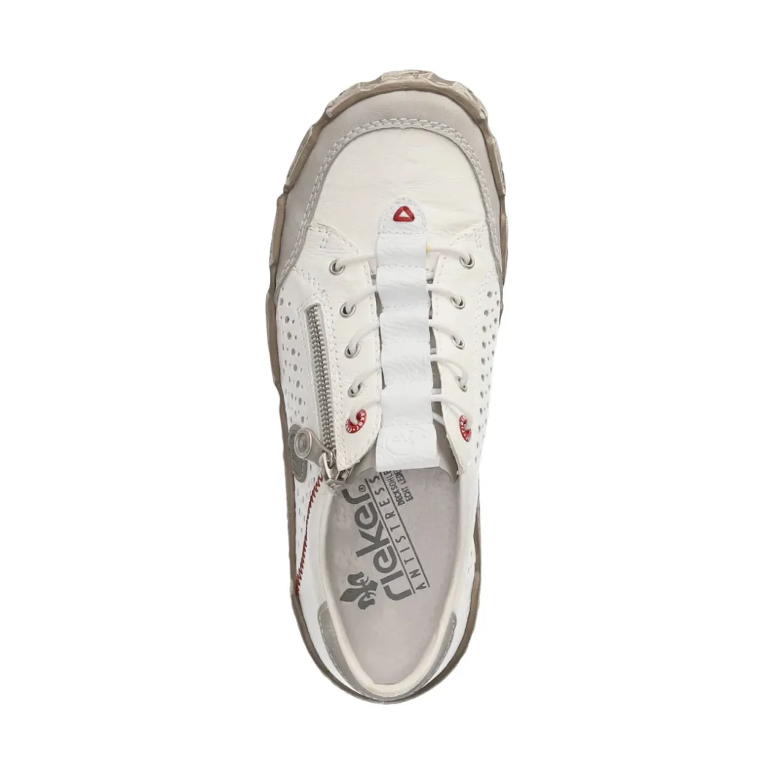 Der weiße Rieker Slipper verbindet sportliches Design mit hohem Tragekomfort. Das Obermaterial aus Leder und Synthetik zeigt einen luftigen Material-Mix mit seitlicher Lochung, der zusammen mit der runden Schuhspitze und dem verstärkten Zehenbereich für Alltagstauglichkeit steht. Der bequeme Reißverschlusseinstieg ergänzt das Elastikband in Schnüroptik und sorgt für einen sicheren Sitz. Eine hautfreundliche, weiche Lederdecksohle schmiegt sich angenehm an, während die flexible Laufsohle im Used-Look und das geringe Gewicht für ein leichtes, dynamisches Gefühl sorgen. Das gelochte Muster unterstreicht die frische Optik, fällt normal aus und begleitet Erwachsene souverän durch den Tag. Modetipp: Mit weißer Wide-Leg-Jeans und gestreifter Hemdbluse entsteht ein cleaner City-Look, ein silberner Armreif setzt einen modernen Akzent.