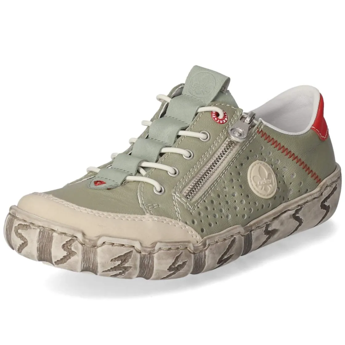Dieser Rieker Slipper in frischem Grün verbindet Leichtigkeit mit durchdachtem Komfort. Das Obermaterial aus Leder und Synthetik zeigt eine gelochte Struktur mit seitlicher Lochung in beige, die für angenehme Luftzirkulation sorgt und den Look elegant akzentuiert. Ein praktischer Reißverschluss erleichtert das An- und Ausziehen, während ein Elastikband in Schnüroptik die sportive Note unterstreicht. Das geringe Gewicht, der leicht gepolsterte Einstieg und das weich gepolsterte Fußbett mit Decksohle aus Leder bieten entspanntes Gehen über den ganzen Tag. Die flexible Laufsohle im Used Look bringt urbanen Charakter, der verstärkte Zehenbereich und dezente rote Details runden das Design ab. Mit runder Schuhspitze und normaler Passform wird zeitloser Stil alltagstauglich. Modetipp: Zu hellen Leinenhosen und einem cremefarbenen Shirt entsteht ein lässiger Sommer-Look.
