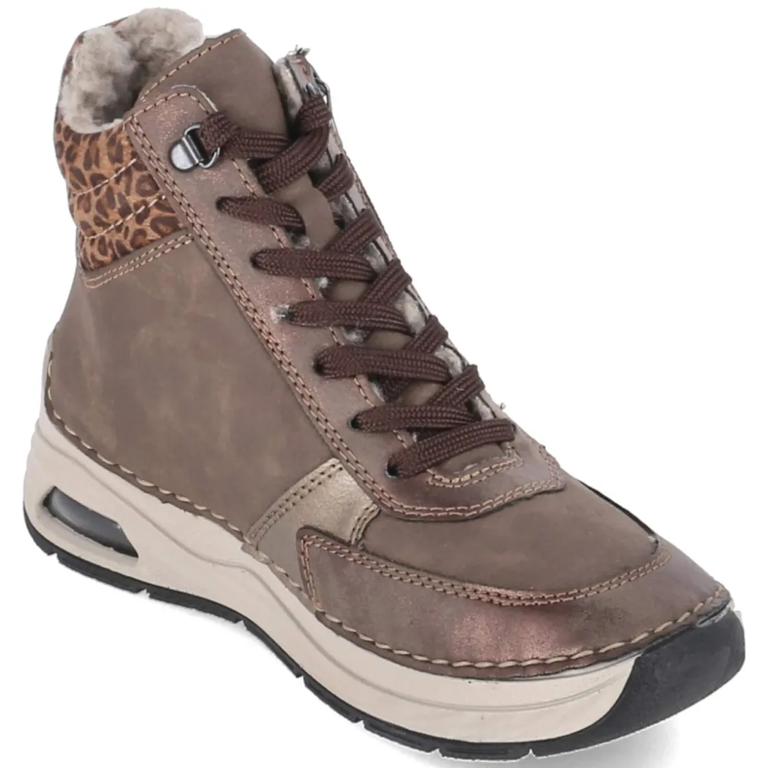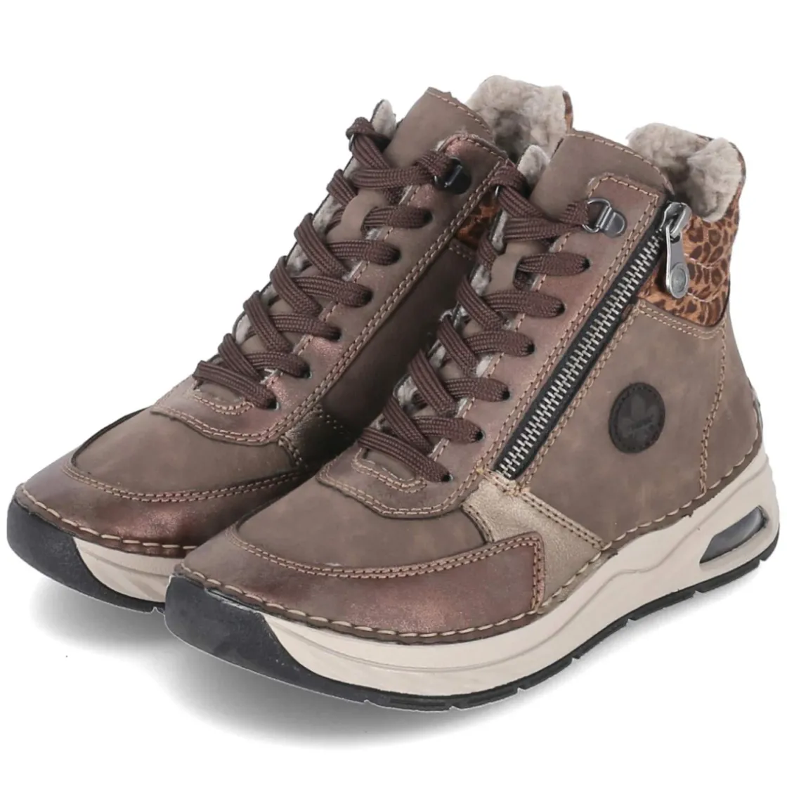 Diese Damen-Stiefeletten von Rieker verbinden sportliches Design mit wohltuendem Komfort für kalte Tage. Das braune Kunstleder-Obermaterial bringt eine pflegeleichte Oberfläche mit, die sich im Alltag unkompliziert bewährt. Warmfutter hält die Füße angenehm temperiert, während die runde Schuhspitze und der bequeme Reißverschlußeinstieg für entspanntes Tragen sorgen. Praktisch ist die Kombination aus Schnürsenkeln und Reißverschluss, die optimalen Halt und schnelles An- und Ausziehen ermöglicht. Eine flexible, rutschfeste Laufsohle gibt Sicherheit auf winterlichen Wegen. Stilvolle Akzente setzen Teile in Bronzeoptik, der gepolsterte Einstieg überrascht mit modernem Leopardenprint. Der Schnitt fällt normal aus und eignet sich für Erwachsene, die Alltagstauglichkeit schätzen. Modetipp: Zu einem camelfarbenen Wollmantel und dunkler Denim entsteht ein harmonischer City-Look; Kupferschmuck greift die Bronze-Details elegant auf.