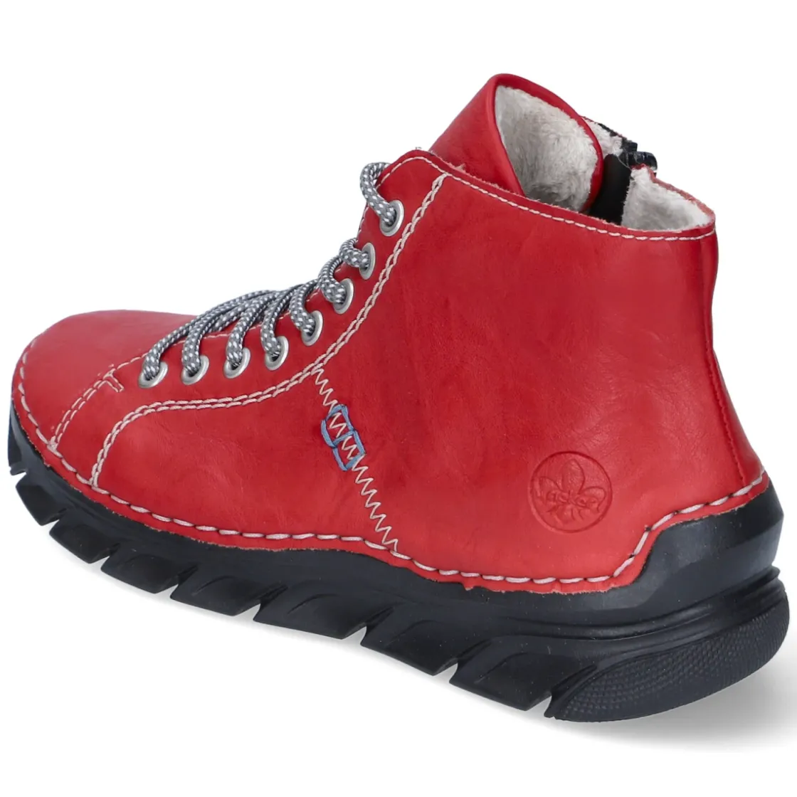 Die Damen-Stiefeletten von Rieker setzen mit ihrem satt roten Obermaterial aus pflegeleichtem Kunstleder ein markantes Statement und verwöhnen zugleich mit spürbarem Komfort. Warmfutter und textile Decksohle umschließen den Fuß weich und halten angenehm temperiert, während die runde Schuhspitze natürliche Bewegungsfreiheit lässt. Die praktische Kombination aus Schnürsenkeln und seitlichem Reißverschluss sorgt für einen bequemen Einstieg und ermöglicht dennoch eine individuelle Anpassung am Spann. Ein herausnehmbares Wechselfußbett eröffnet zusätzlichen Platz für eigene Einlagen und unterstützt ein hygienisches Tragegefühl im Alltag. Dank ihrer ausgewogenen Formgebung passen die Stiefeletten zu vielseitigen City- und Freizeit-Looks und überzeugen mit langlebiger Pflegeleichtigkeit. Modetipp: Zu einem Strickkleid und blickdichten Strumpfhosen getragen entsteht ein femininer Winterlook, den ein klassischer Mantel in Karamell oder Camel stilvoll abrundet.