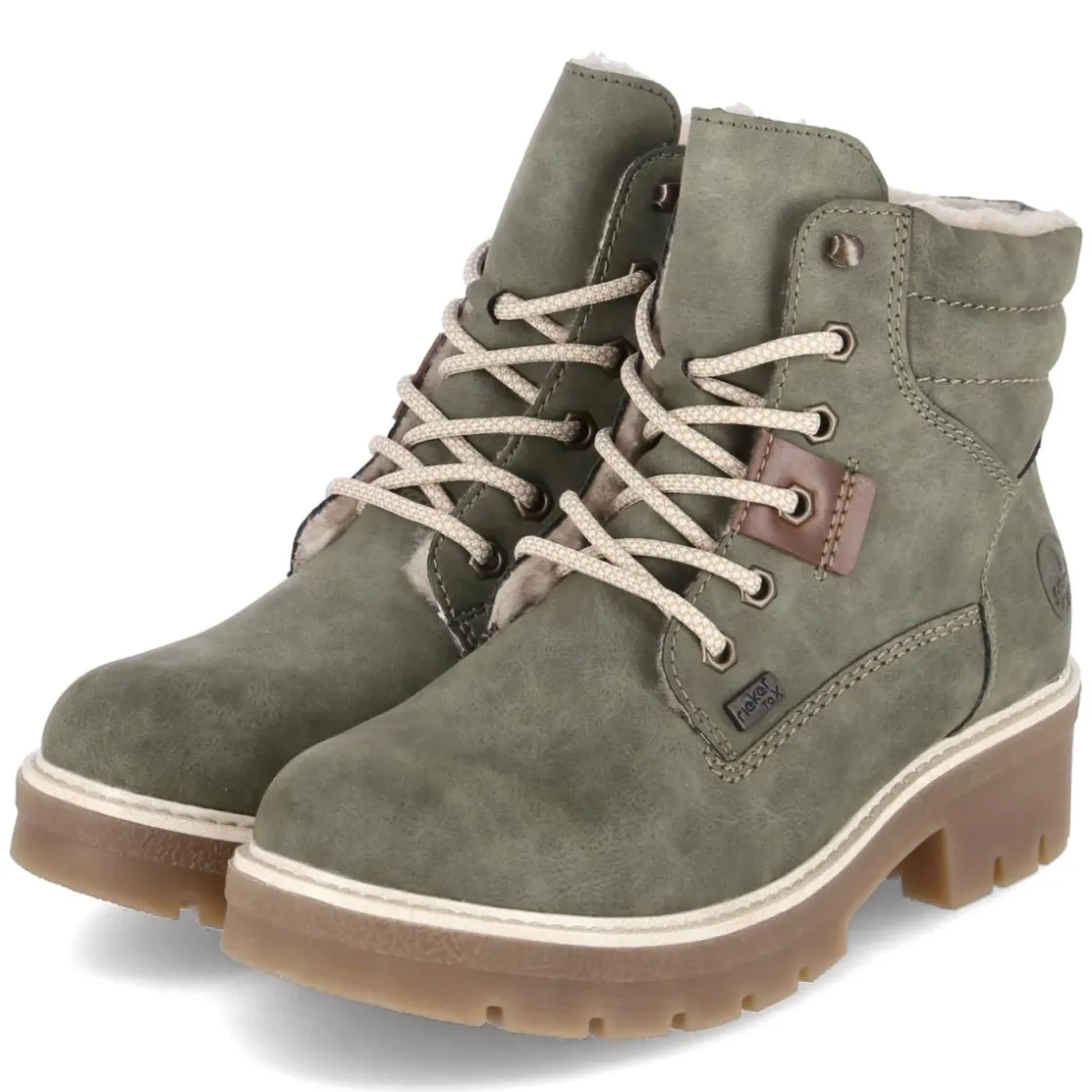Diese Winterboots von Rieker vereinen Komfort und Stil für kalte Tage. Das grüne Obermaterial aus Synthetik zeigt einen natürlichen Look und wirkt dank wasserabweisender, atmungsaktiver Eigenschaften angenehm bei wechselhaftem Wetter. Warmfutter mit softem Teddyfutter umschließt den Fuß, der gepolsterte Einstieg mit feiner Querstepp-Struktur erhöht den Tragekomfort. Ein 4,5 cm hoher Blockabsatz bietet stabilen Halt, die rutschfeste Profilsohle sorgt für Grip auf glatten Wegen. Runde Schuhspitze, Schnürung plus Klettverschluss und eine textile Decksohle runden das Tragegefühl ab. Das gepolsterte Wechselfußbett lässt sich bei Bedarf gegen eigene Einlagen tauschen. Die Passform fällt schmaler aus; häufig passt eine Nummer größer besser. Modetipp: Ton-in-Ton zur satten Grünnuance wirken ein cremefarbener Strickpullover, Wollmantel in Camel und grobe Wollsocken besonders harmonisch.