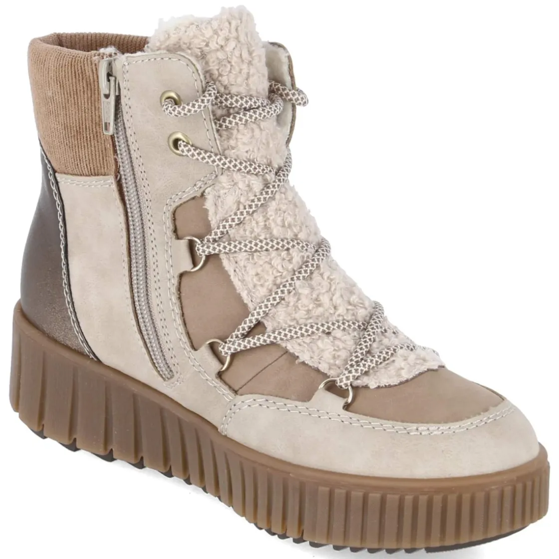 Wintertauglicher Komfort trifft urbanen Stil: Die Rieker Damen-Winterboots in Beige setzen auf einen modernen Material-Mix aus Textil und Synthetik und punkten mit einem 4 cm hohen Plateau, das Auftritt dämpft und dezent Höhe schenkt. Warmfutter inklusive kuscheligem Teddyfutter umschließt den Fuß, der gepolsterte Einstieg und das weich gepolsterte, herausnehmbare Fußbett steigern den Tragekomfort im Alltag. Schnürsenkel sorgen für die individuelle Weitenregulierung, der seitliche Reißverschluss für den bequemen Einstieg. Die runde Spitze, die textile Decksohle sowie verstärkte Zehen- und Fersenpartien machen das Modell robust und alltagstauglich. Mit normal ausfallender Passform ideal für Erwachsene, die zuverlässige Begleiterinnen für kalte Tage suchen. Modetipp: Zu Wollmantel, Straight-Jeans und grobem Strick in Creme entsteht ein stilvolles Ton-in-Ton-Winteroutfit.
