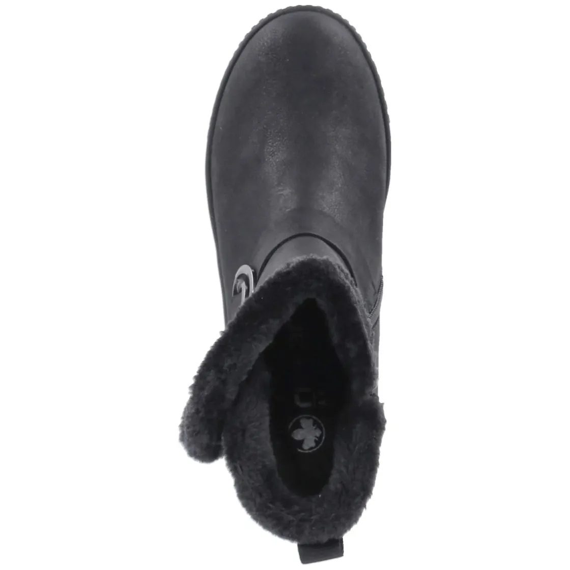Schwarz, schlicht und winterfest: Diese Rieker-Winterstiefeletten verbinden ein rundes, feminines Design mit funktionaler Ausstattung für kalte Tage. Das Obermaterial aus Textil und Synthetik bildet einen wasserfesten Material-Mix, der zusammen mit der wasserabweisenden Ausrüstung Schutz bei Niesel und Schneematsch bietet. Warmfutter umschließt den Fuß angenehm, während die rutschfeste Laufsohle sicheren Halt verleiht. Der bequeme Reißverschlußeinstieg erleichtert das Anziehen, eine Anziehlasche unterstützt zusätzlich. Dank Wechselfußbett lassen sich persönliche Einlagen nutzen. Die schmale Kunstfellkrempe und ein Zierriemen über dem Spann setzen dezente Akzente, die runde Schuhspitze unterstreicht den komfortablen Charakter. Der Schnitt fällt normal aus und eignet sich für den täglichen Einsatz von Stadtbummel bis Pendelweg. Modetipp: Zu schwarzem Strickkleid, Thermoleggings und Oversize-Wollmantel entsteht ein eleganter, wintertauglicher Look mit farbigem Schal als Kontrast.