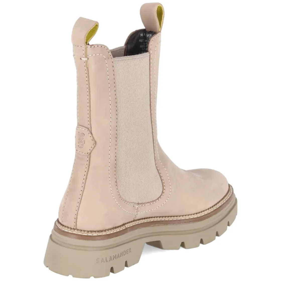 Zeitloser Begleiter in Beige: der Salamander Chelsea Boot für Damen überzeugt durch weiches Rauleder aus langlebigem Echtleder und eine moderne, klare Linienführung. Die runde Spitze und der 5 cm hohe Blockabsatz sorgen für komfortables Abrollen und eine feminine Silhouette. Zwei große, seitliche Elastikeinsätze und Anziehlaschen erleichtern das Hineinschlüpfen, der schmale Einstieg und die schmale, verstärkte Ferse geben sicheren Halt. Die starke Profilsohle bietet Grip bei wechselhaften Bedingungen, die textile Decksohle erhöht den Tragekomfort. Dank klassischem, verschlusslosem Design lassen sich vielfältige Looks realisieren; der Fit fällt normal aus und passt zu erwachsenen Zielgruppen. Modetipp: Zu einer hellen Straight-Jeans, Oversize-Strick und einem beigen Wollmantel kombinieren, dazu goldfarbene Accessoires für einen harmonischen Ton-in-Ton-Look.
