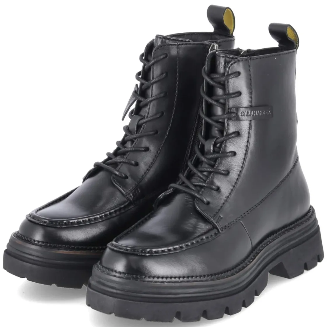 Der Salamander Schnürboots verbindet zeitlose Ästhetik mit Alltagstauglichkeit. Schwarzes Glattleder in langlebiger Qualität formt die runde Silhouette, während der 4,5 cm hohe Blockabsatz stabilen Halt gibt. Die Kombination aus Schnürung und seitlichem Reißverschluss erleichtert das An- und Ausziehen und ermöglicht eine präzise Weitenregulierung. Ein leichtes Fleecefutter wärmt an kühlen Tagen, die textile Decksohle sorgt für angenehmen Fußkontakt. Die rutschfeste Profilsohle bietet verlässliche Traktion, die verstärkte Ferse zusätzliche Stabilität. Eine markante Wulstnaht auf dem Schuhdeck unterstreicht den robust-eleganten Look. Der Schuh fällt normal aus und eignet sich damit ideal für die gewohnte Größe. Modetipp: Gelungen wirkt der Boot zu Cropped-Jeans und Wollmantel, ebenso zu Midikleid und blickdichter Strumpfhose für einen ausbalancierten, urbanen Stil.