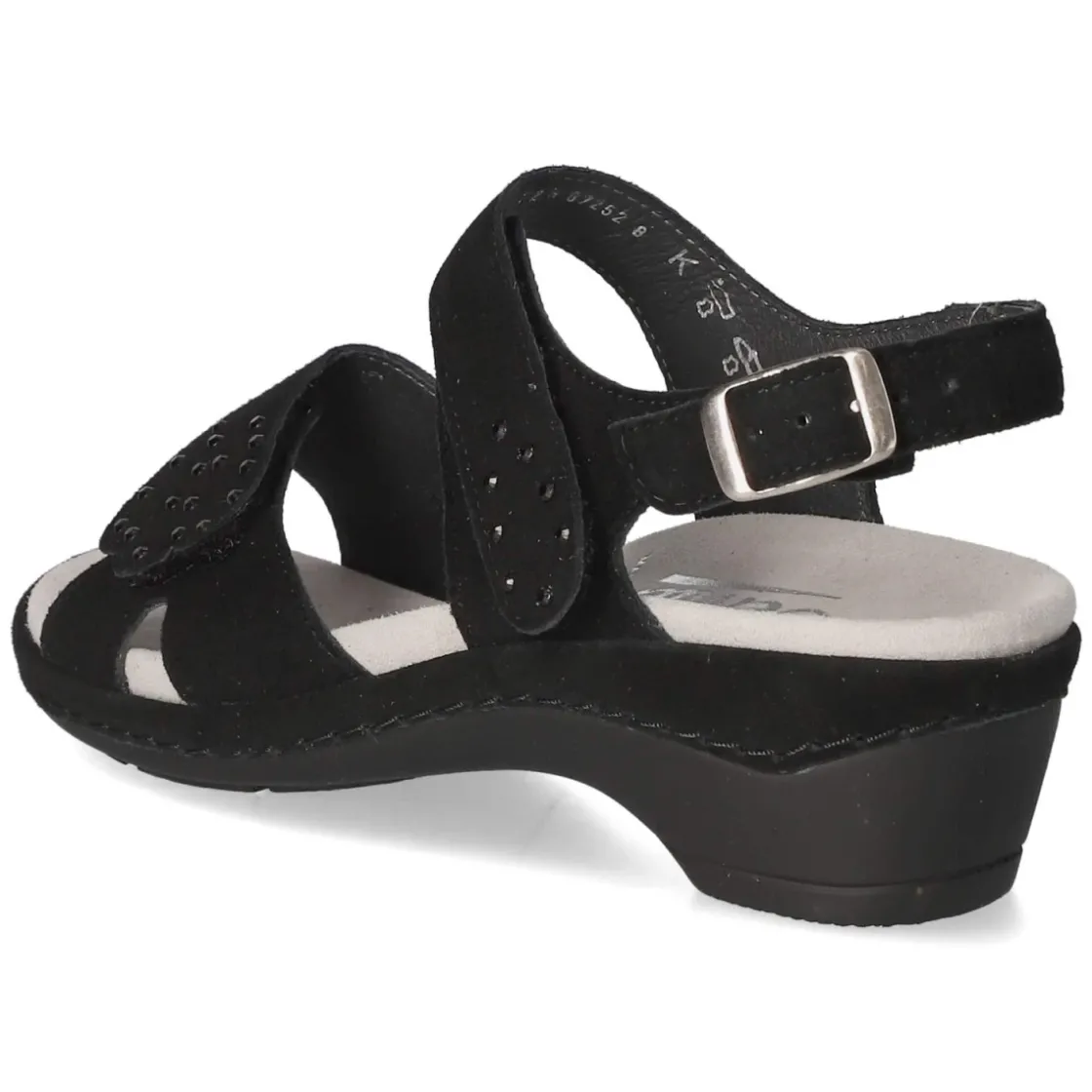 Diese Damen-Sandale von Semler verbindet edles Design mit wohltuendem Komfort. Weiches Rauleder in zeitlosem Schwarz umschmeichelt den Fuß, während atmungsaktives Echtleder innen für ein angenehm temperiertes Klima sorgt. Zwei Klettverschlüsse erlauben eine individuelle Anpassung, ergänzt von Schnalle und Druckknopf als praktische und dekorative Akzente. Schimmernde Schmucksteine setzen einen dezenten Glanz, die offene Spitze verleiht sommerliche Leichtigkeit. Ein vorgeformtes, gepolstertes Lederfußbett lässt sich bei Bedarf wechseln und unterstützt müheloses Gehen. Der 3,5 cm hohe Blockabsatz bietet sicheren Stand, die flexible, rutschhemmende Laufsohle verbessert die Traktion auf unterschiedlichen Untergründen. Das Modell fällt normal aus und eignet sich ideal für Erwachsene, die Wert auf Qualität legen. Modetipp: Besonders elegant wirkt die Sandale zu fließenden Midikleidern oder verkürzten Leinenhosen in Naturtönen.