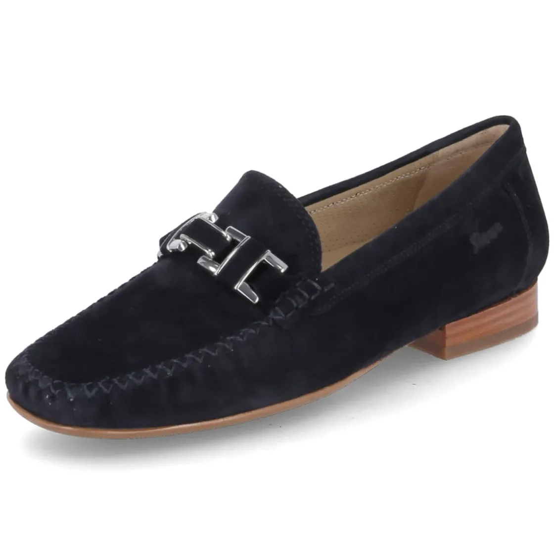 Der Mokassin CAMBRIA von Sioux verbindet eine samtige Oberfläche aus feinem Rauleder mit zeitloser Eleganz. Das tiefe Blau kann je nach Licht fast schwarz wirken und wird vom silbern glänzenden Zierriemen dezent veredelt. Die runde Schuhspitze und der schmale Blockabsatz in Holzoptik sorgen für eine feminine Linie, während verstärkte Ferse, Lederfutter und die hautfreundliche Lederdecksohle gepflegten Komfort bieten. Die sehr flexible, dünne Laufsohle unterstützt einen geschmeidigen Abrollvorgang, das Schlupf-Design ohne Verschluss erleichtert den Einstieg. Die Passform fällt normal aus und eröffnet gute Kombinationsmöglichkeiten vom Office-Look bis zum Wochenend-Style. Modetipp: Ton-in-Ton mit dunkelblauer Zigarettenhose und heller Bouclé-Jacke tragen oder mit gestreiftem Shirt und cropped Jeans für eine moderne, maritime Note inszenieren.