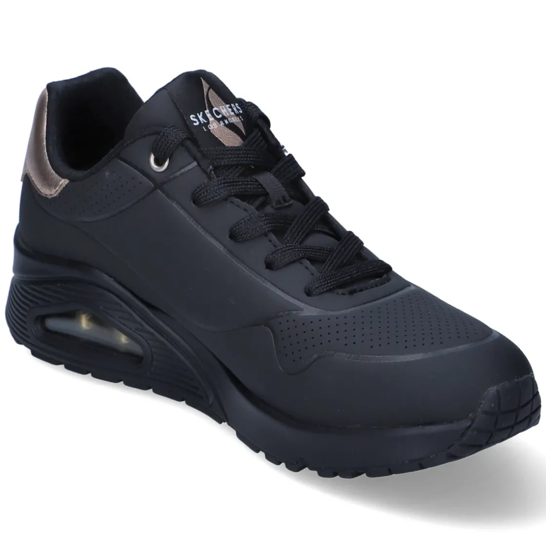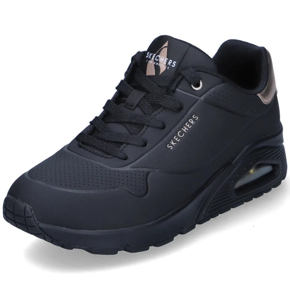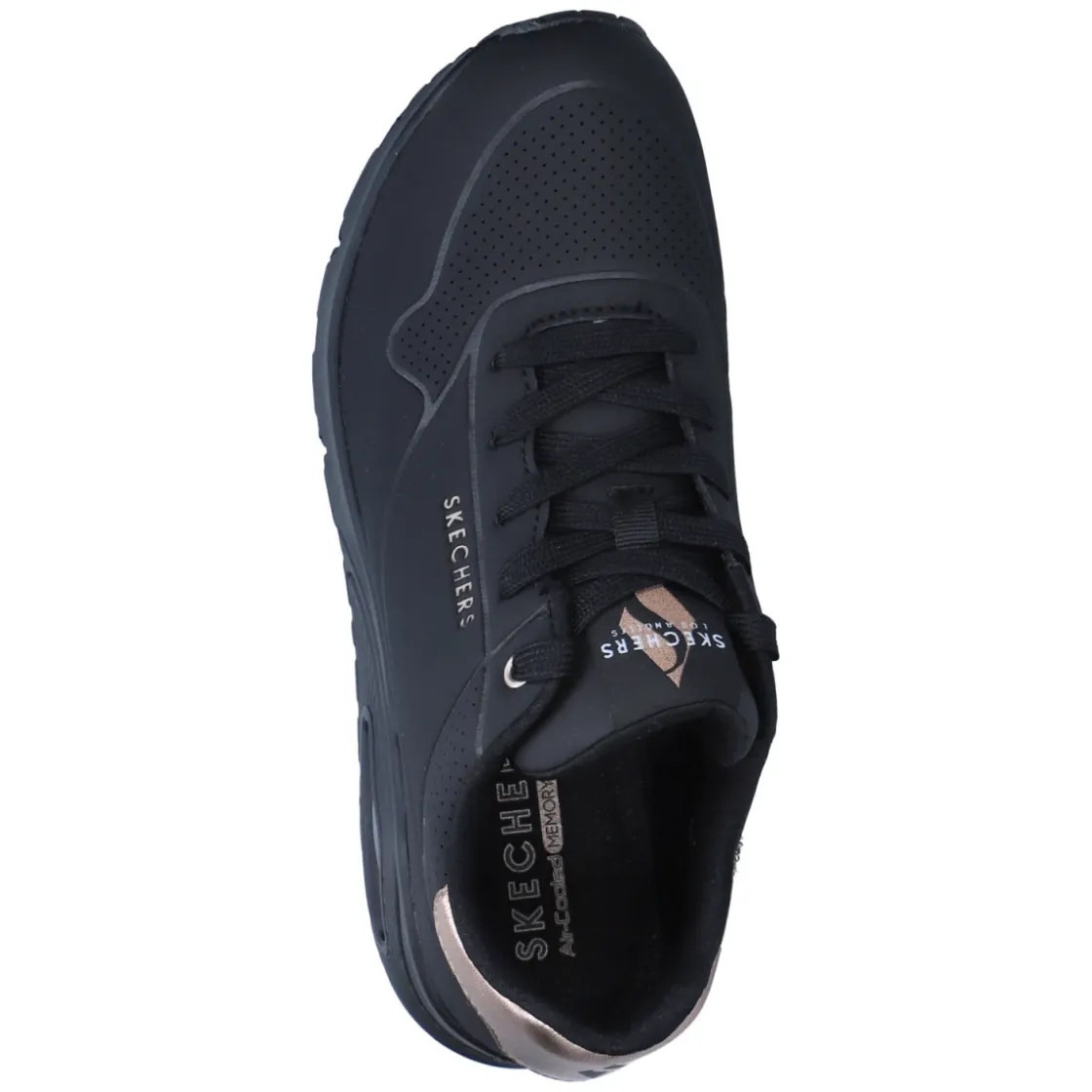 Der Low Sneaker GOLDEN AIR von Skechers vereint sportliches Design mit hohem Tragekomfort. Das pflegeleichte Kunstleder-Obermaterial zeigt sich in sattem Schwarz, akzentuiert durch edle Kupferdetails, während die runde Spitze und der gepolsterte Einstieg ein angenehmes Fußgefühl unterstützen. Die textile Decksohle ist mit Air-Cooled Memory Foam weich gepolstert und in Verbindung mit dem Wechselfußbett besonders komfortabel bei langen Tagen. Eine Schnürung ermöglicht die individuelle Anpassung, verstärkte Zehen- und Fersenpartien geben Stabilität. Die flexible, rutschhemmende Laufsohle mit Profil sorgt für sicheren Halt im Alltag. Der Schnitt fällt normal aus und macht das Modell zum unkomplizierten Allrounder von City bis Casual Friday. Modetipp: Mit Cropped-Jeans, schwarzem Blazer und zarten Schmuckdetails in Kupfer harmonieren die Akzente besonders stilvoll.