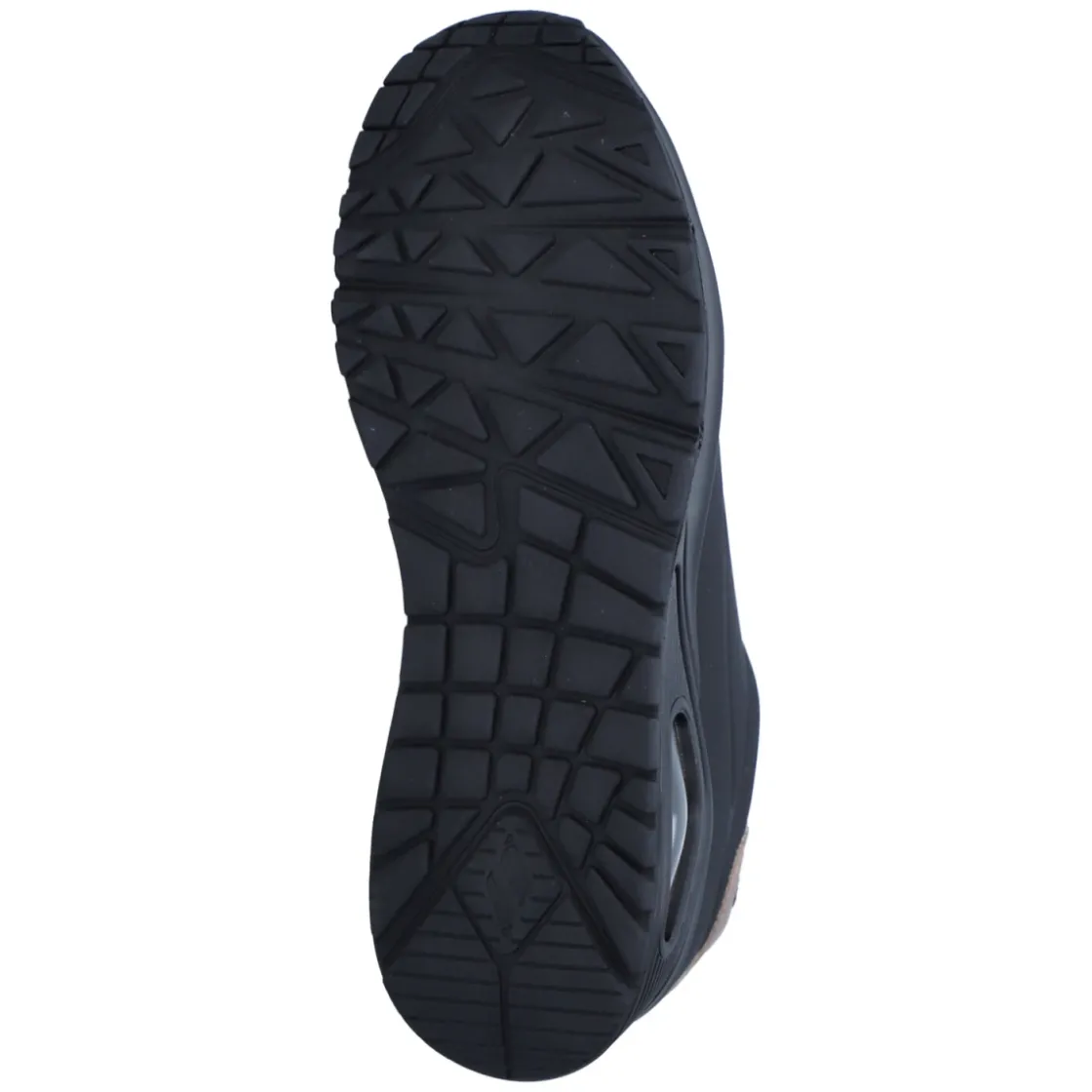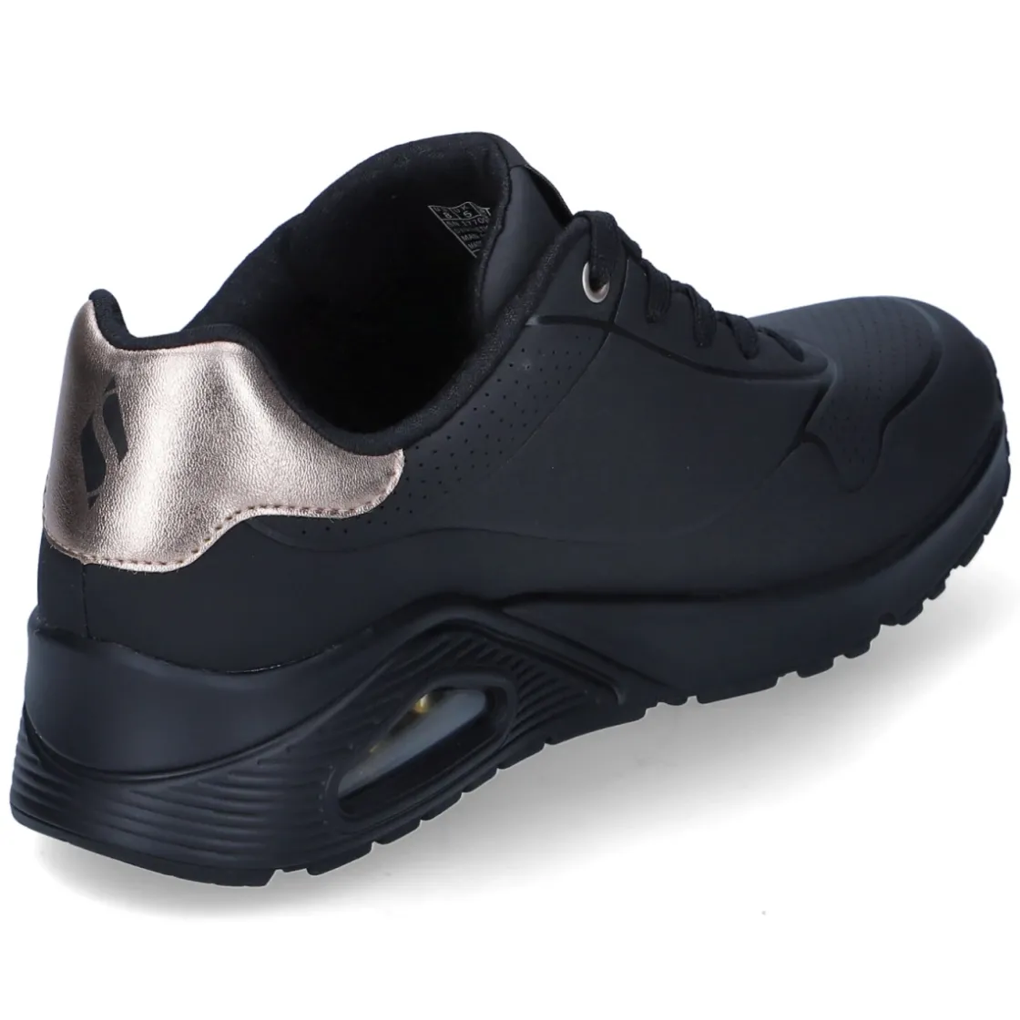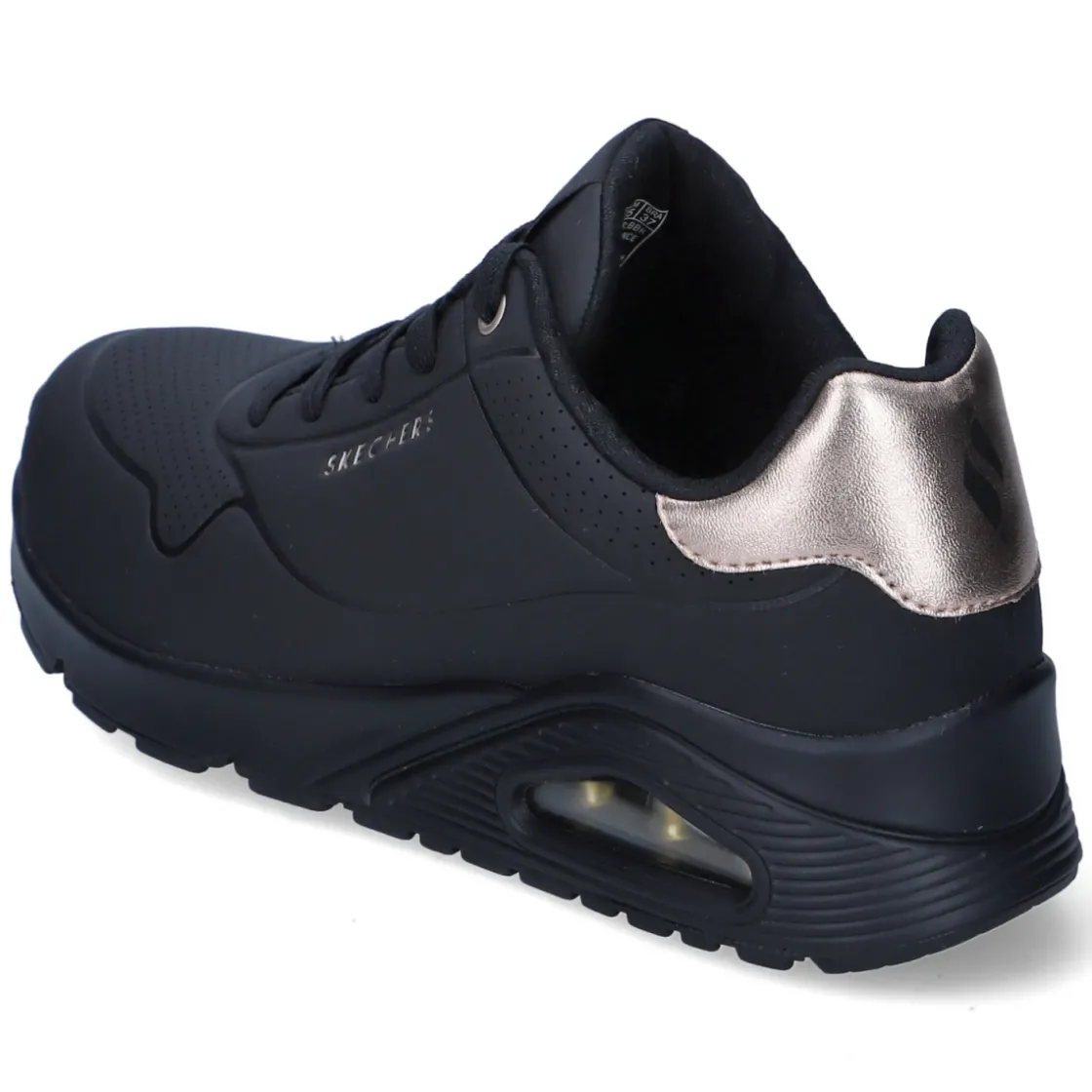 Der Low Sneaker GOLDEN AIR von Skechers vereint sportliches Design mit hohem Tragekomfort. Das pflegeleichte Kunstleder-Obermaterial zeigt sich in sattem Schwarz, akzentuiert durch edle Kupferdetails, während die runde Spitze und der gepolsterte Einstieg ein angenehmes Fußgefühl unterstützen. Die textile Decksohle ist mit Air-Cooled Memory Foam weich gepolstert und in Verbindung mit dem Wechselfußbett besonders komfortabel bei langen Tagen. Eine Schnürung ermöglicht die individuelle Anpassung, verstärkte Zehen- und Fersenpartien geben Stabilität. Die flexible, rutschhemmende Laufsohle mit Profil sorgt für sicheren Halt im Alltag. Der Schnitt fällt normal aus und macht das Modell zum unkomplizierten Allrounder von City bis Casual Friday. Modetipp: Mit Cropped-Jeans, schwarzem Blazer und zarten Schmuckdetails in Kupfer harmonieren die Akzente besonders stilvoll.