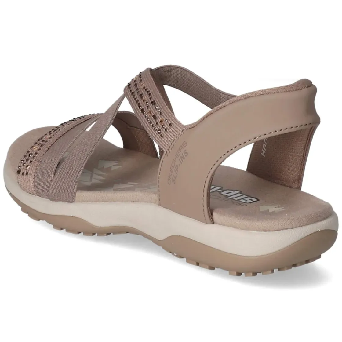 Die Skechers Sandalen SUMMER SPARKLE verbinden sommerliche Leichtigkeit mit funkelnden Details. In Taupe gehalten und mit gekreuzten Riemen veredelt, setzen braune Schmucksteine dezente Highlights. Das weiche, gepolsterte Fußbett und der gepolsterte Fersenriemen sorgen für langanhaltenden Komfort, während die flexible, rutschhemmende Laufsohle sicheren Halt bietet. Dank Slip-Ins gelingt der unkomplizierte Einstieg ohne Verschluss im Handumdrehen. Das Obermaterial aus Textil und Synthetik sowie eine textile Decksohle fühlen sich angenehm an, die offene Schuhspitze unterstreicht die luftige Silhouette. Der Größenhinweis fällt normal aus und erleichtert die Wahl. Vegan gefertigt, ideal für bewusste Sommerlooks mit glänzender Note. Modetipp: Zu einem fließenden Leinenkleid in Creme und einer Basttasche entsteht ein eleganter, entspannt-luxuriöser Urlaubslook.
