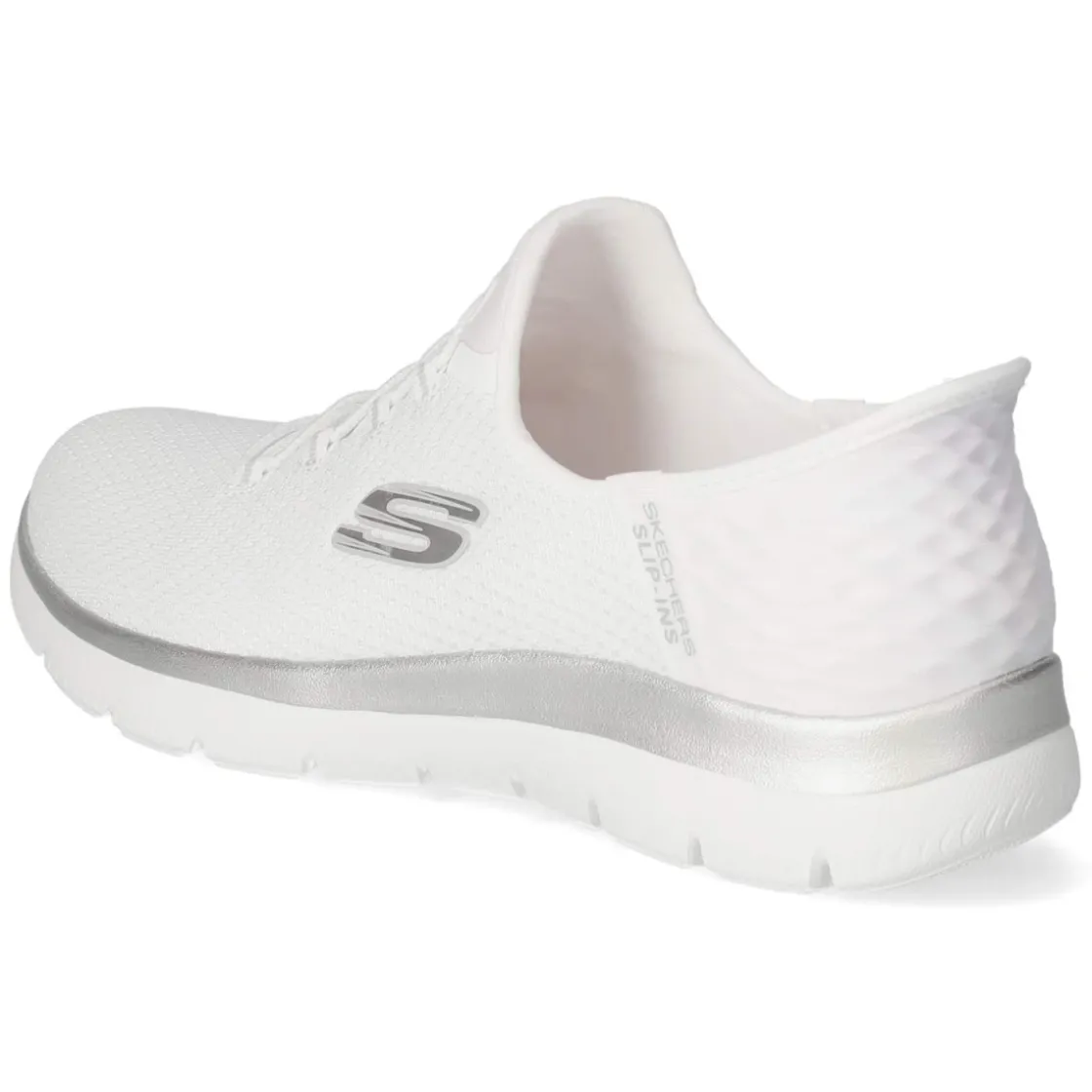 Der Sneaker DIAMOND DREAM von Skechers setzt auf cleanes Weiß und subtile, silberne Highlights, die jedem Look eine frische Note verleihen. Das textile Obermaterial schmeichelt dem Fuß, die runde Spitze sorgt für zeitlosen Appeal. Dank Slip-on-Design ohne Verschluss gelingt der Einstieg mühelos, während ein Elastikband den Sitz flexibel und sicher hält. Die bewährte Memory-Foam-Fußbettung polstert weich und unterstützt bei langen Tagen, die textile Decksohle liegt angenehm am Fuß. Eine flexible Laufsohle ermöglicht natürliche Abrollbewegungen und guten Grip im Alltag. Das Modell fällt normal aus und besteht aus veganen Materialien – ideal für bewusste Sneaker-Fans. Modetipp: Zu gerader Jeans, weißem T-Shirt und beigem Trenchcoat entsteht ein moderner City-Look, den silberner Schmuck perfekt auf die Schuhdetails abstimmt.