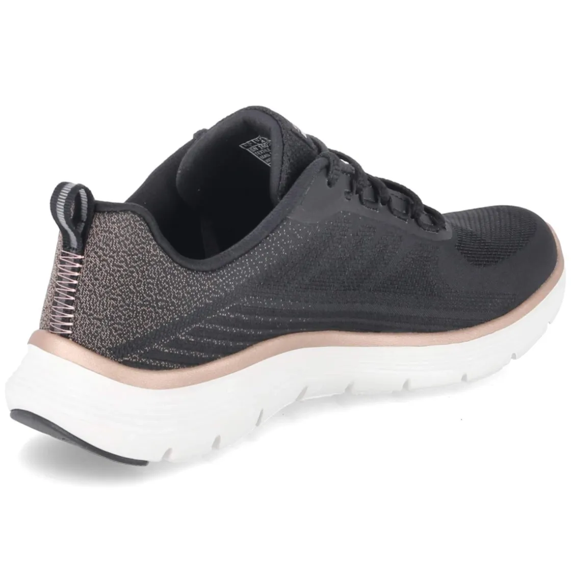 Der Skechers Sneaker ELEGANT GLOW verbindet sportliche Leichtigkeit mit edlem Finish. Das atmungsaktive Textilobermaterial in tiefem Schwarz wird von bronzefarbenen Highlights und einer passenden Ferse akzentuiert, wodurch der Look modern und vielseitig bleibt. Eine runde Schuhspitze und der klassische Schnürverschluss sorgen für bequemen Halt, während die beste Memory-Foam-Fußbettung jeden Schritt weich abfedert. Die flexible Laufsohle mit rutschfesten Elementen bietet zuverlässige Traktion im Alltag. Die Decksohle aus Textil schmiegt sich angenehm an, und das Modell fällt größengetreu aus. Praktisch im Pflegealltag: Der Sneaker ist waschmaschinengeeignet. Hergestellt aus veganen Materialien, liefert der FLEX APPEAL 5.0 ELEGANT GLOW Performance und Stil für Erwachsene, die Wert auf komfortable Damen-Sneaker legen. Modetipp: Zu einer schwarzen Wide-Leg-Hose und einem bronzefarbenen Satin-Top entsteht ein harmonisches, urban-elegantes Ensemble.
