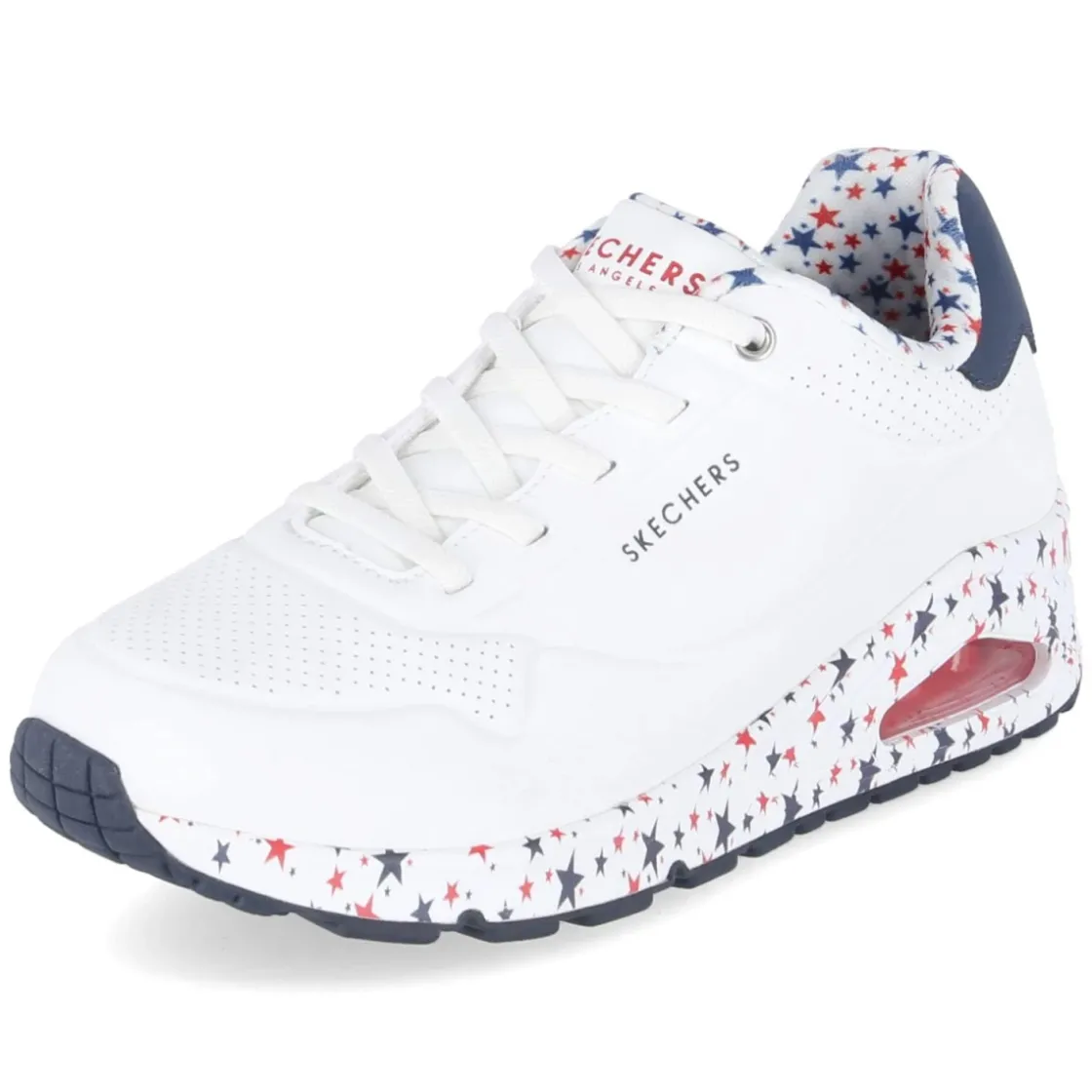 Der Skechers Sneaker UNO-FREE STRYDE vereint cleanes Design mit hohem Tragekomfort. Die moderne Optik in strahlendem Weiß wird von dynamischen Prägungen und feiner Lochung im Zehenbereich belebt. Dank elastischem Band in Schnüroptik gelingt der unkomplizierte Einstieg, während der gepolsterte Schaftrand sanft umschließt. Die beste Memory-Foam-Fußbettung passt sich dem Fuß an und sorgt gemeinsam mit der flexiblen, rutschfesten Laufsohle mit markantem Sternenrand und Sichtfenster für angenehme Dämpfung im Alltag. Das pflegeleichte Synthetik-Obermaterial lässt sich leicht reinigen, die Passform fällt normal aus, die runde Spitze gibt Zehenfreiheit. Ein vielseitiger Begleiter für City, Büro und Freizeit, der Funktion und Stil verbindet. Modetipp: Monochrom gestylt mit weißer Wide-Leg-Jeans und cremefarbenem Stricktop entsteht ein frischer Ton-in-Ton-Look; ein strukturiertes Blazer-Update setzt einen edlen Kontrast.