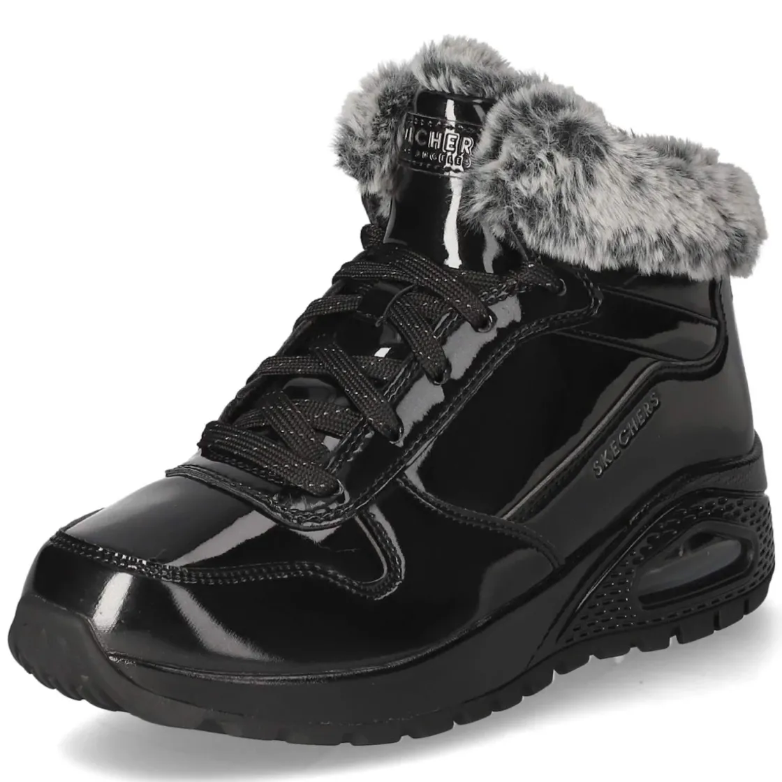 Der Skechers Sneaker UNO RUGGED vereint sportliche Linien mit einer eleganten Lackoptik in tiefem Schwarz. Das synthetische Obermaterial zeigt sich glatt und charakterstark, die runde Spitze wahrt den komfortablen Auftritt. Innen sorgt ein warmes Futter für behagliches Klima an kalten Tagen, während die textile Decksohle weich begleitet. Die Schnürung erlaubt präzise Anpassung und stabilen Halt, ohne die klare Silhouette zu stören. Die Passform fällt normal aus und macht die Wahl der Größe unkompliziert. Mit seinem cleanen Look passt das Modell zu urbanen Winterstyles ebenso wie zu dezenten Business-Casual-Outfits. Modetipp: Den Glanz des Schuhs mit matten Texturen wie Wollmantel, grobem Strick und einer geraden Denim balancieren, dazu eine strukturierte Crossbody-Bag für einen modernen Kontrast.