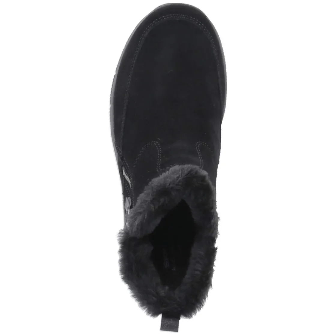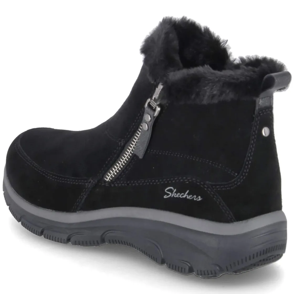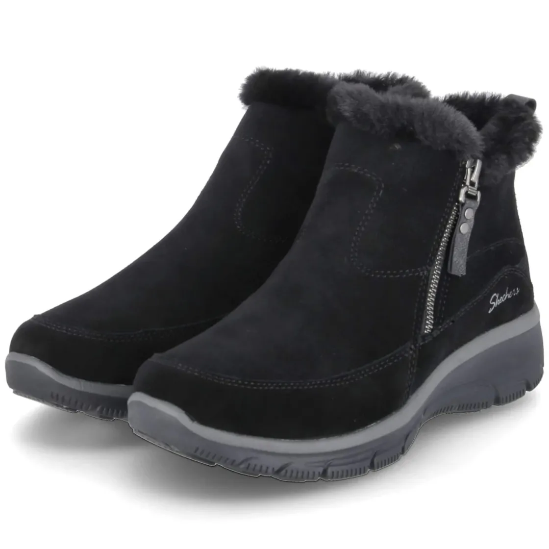 Die Skechers Stiefeletten COOL ZIP! vereinen robustes Echtleder in edlem Rauleder-Finish mit sportlichem Design in klassischem Schwarz. Wasserabweisende Eigenschaften und die scotchguard durable protection unterstützen den Alltag bei wechselhaftem Wetter. Das runde Leistenbild und ein verstärkter Fußrahmen sorgen für Stabilität, während die flexible, rutschfeste Profilsohle verlässlichen Grip liefert. Für spürbaren Komfort steht die beste Memory-Foam-Fußbettung, die zusammen mit dem relaxten Leichtgewicht ein angenehmes Tragegefühl schafft. Ein seitlicher Elastikeinsatz erleichtert den Einstieg, die Kunstfellkrempe setzt einen winterlichen Akzent. Mit Reißverschluss schnell an- und auszuziehen und in der Passform normal ausfallend. Modetipp: Zur Skinny-Jeans und Oversize-Strick kombinieren, dazu eine kurze Pufferjacke – die Kunstfellkrempe greift Kunstpelz-Details perfekt auf.
