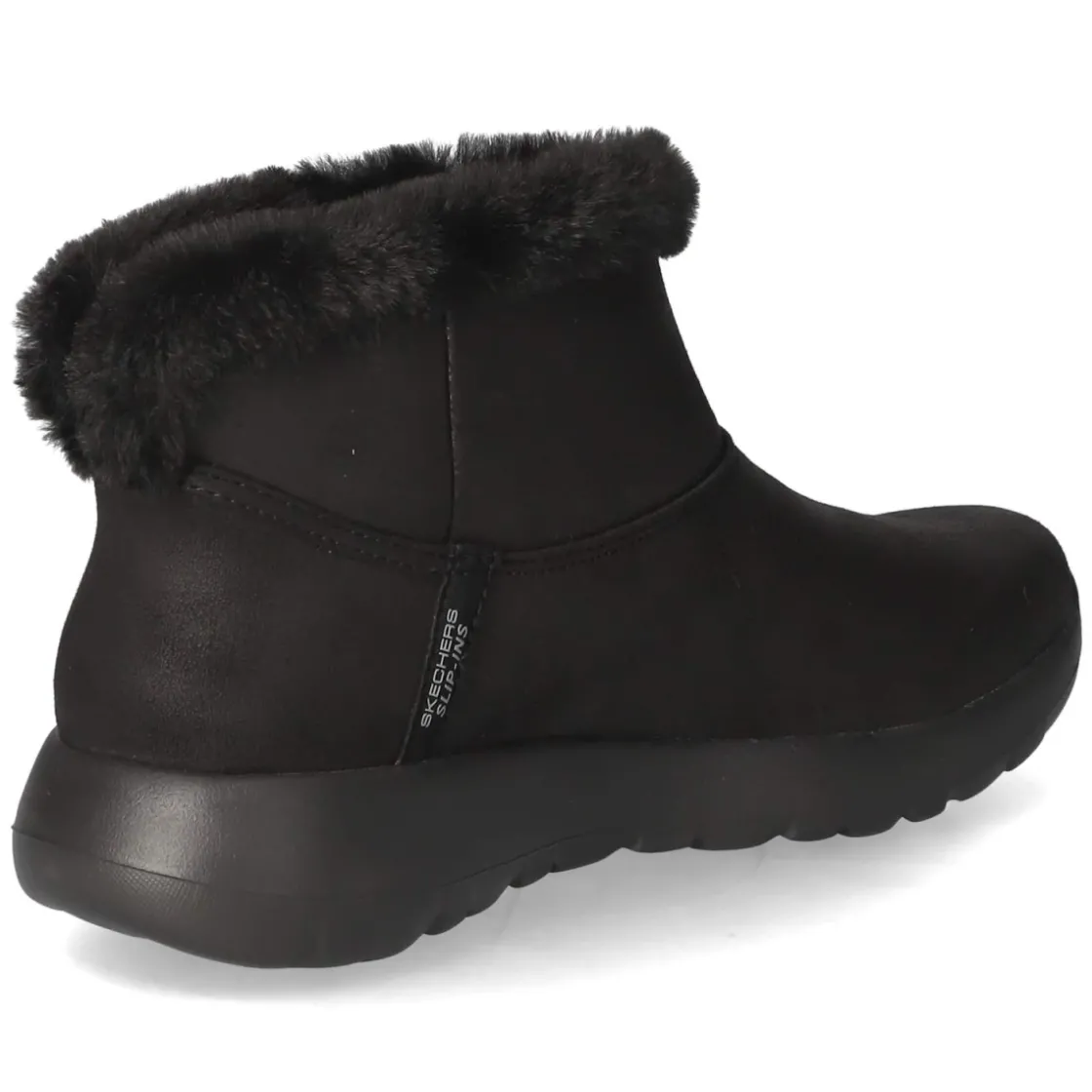 Die Stiefeletten ON THE GO JOY von Skechers verbinden winterlichen Komfort mit urbaner Schlichtheit. Das schwarze Obermaterial aus Textil und das weiche Warmfutter schmiegen sich angenehm an, der Schaftrand mit Kunstfellkragen setzt einen dezenten Akzent. Dank unkompliziertem Einstieg ohne Verschluss gelingt das Hineinschlüpfen schnell, während die runde Spitze und der verstärkte Zehen- und Fersenbereich für ein sicheres Tragegefühl sorgen. Wasserabweisende Eigenschaften und Scotchgard Protect unterstützen im Alltag, das gepolsterte Fußbett federt Schritte sanft ab. Die flexible, rutschhemmende Laufsohle bietet Halt auf glatten Böden. Passformhinweis: fällt normal aus. Gefertigt aus veganen Materialien – ideal für bewusste Garderoben. Modetipp: zu gerippten Strickkleidern und einem langen Wollmantel kombinieren, dazu blickdichte Strumpfhose und eine Crossbody-Bag für einen modernen City-Look.
