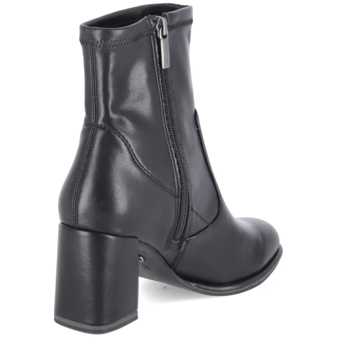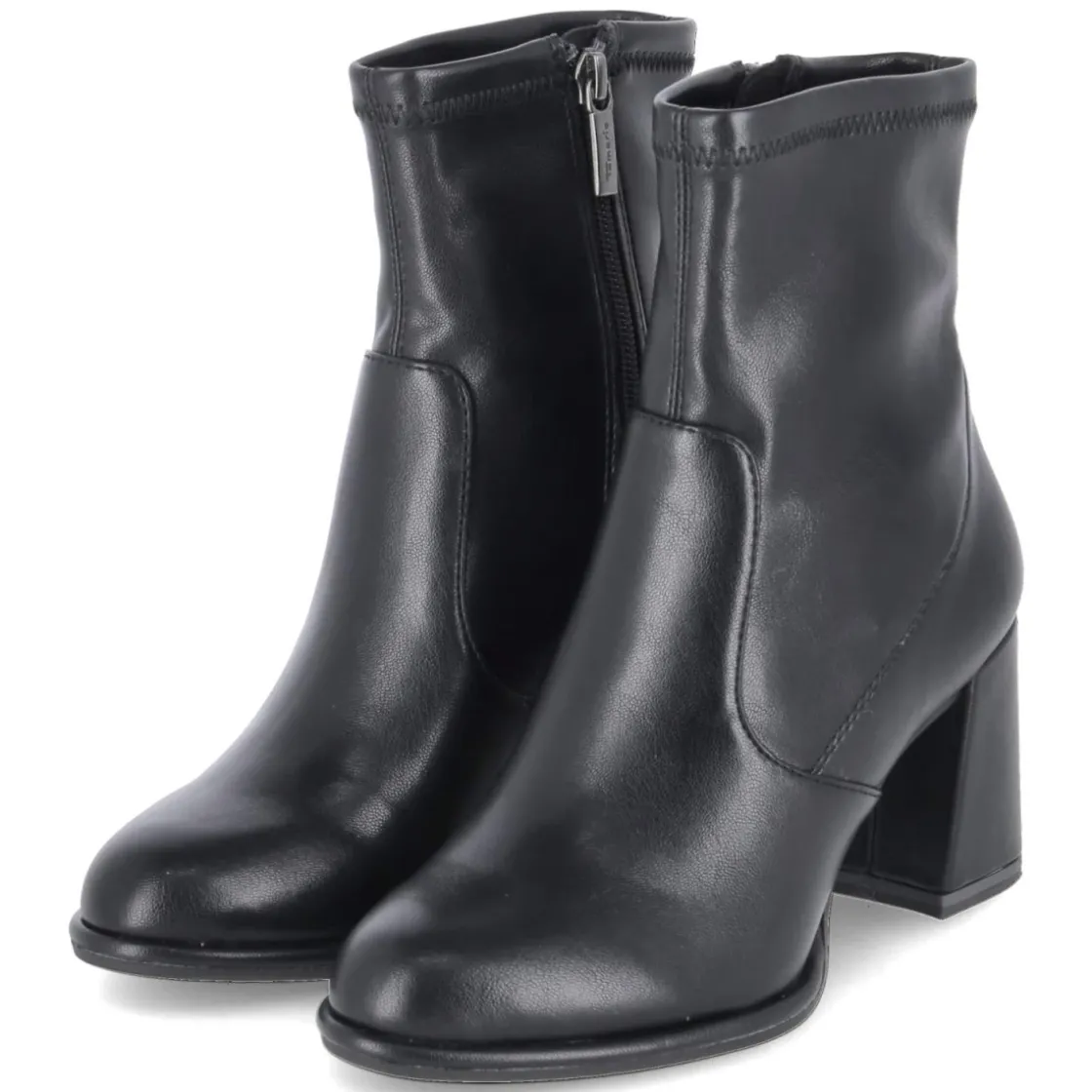 Diese Tamaris Ankle Boots verbinden elegante Optik mit alltagstauglichem Komfort. Aus veganen Materialien gefertigt, überzeugt das schwarze Modell mit synthetischem Obermaterial und einer weichen Decksohle aus Textil. Der 8 cm hohe Blockabsatz streckt die Silhouette und bietet gleichzeitig verlässliche Stabilität, während die runde Schuhspitze den Look modern und feminin abrundet. Ein seitlicher Reißverschluss ermöglicht unkompliziertes An- und Ausziehen, der leicht stretchige Schaft schmiegt sich angenehm an. Für sicheren Halt sorgt die flexible, rutschfeste Laufsohle, das gepolsterte Fußbett federt jeden Schritt. Fällt größengetreu aus und passt zu Business wie Freizeit. Modetipp: zu verkürzten Marlenehosen und einem feinen Stricktop kombinieren, dazu eine strukturierte Schultertasche – so entsteht ein lässig-edler City-Look.