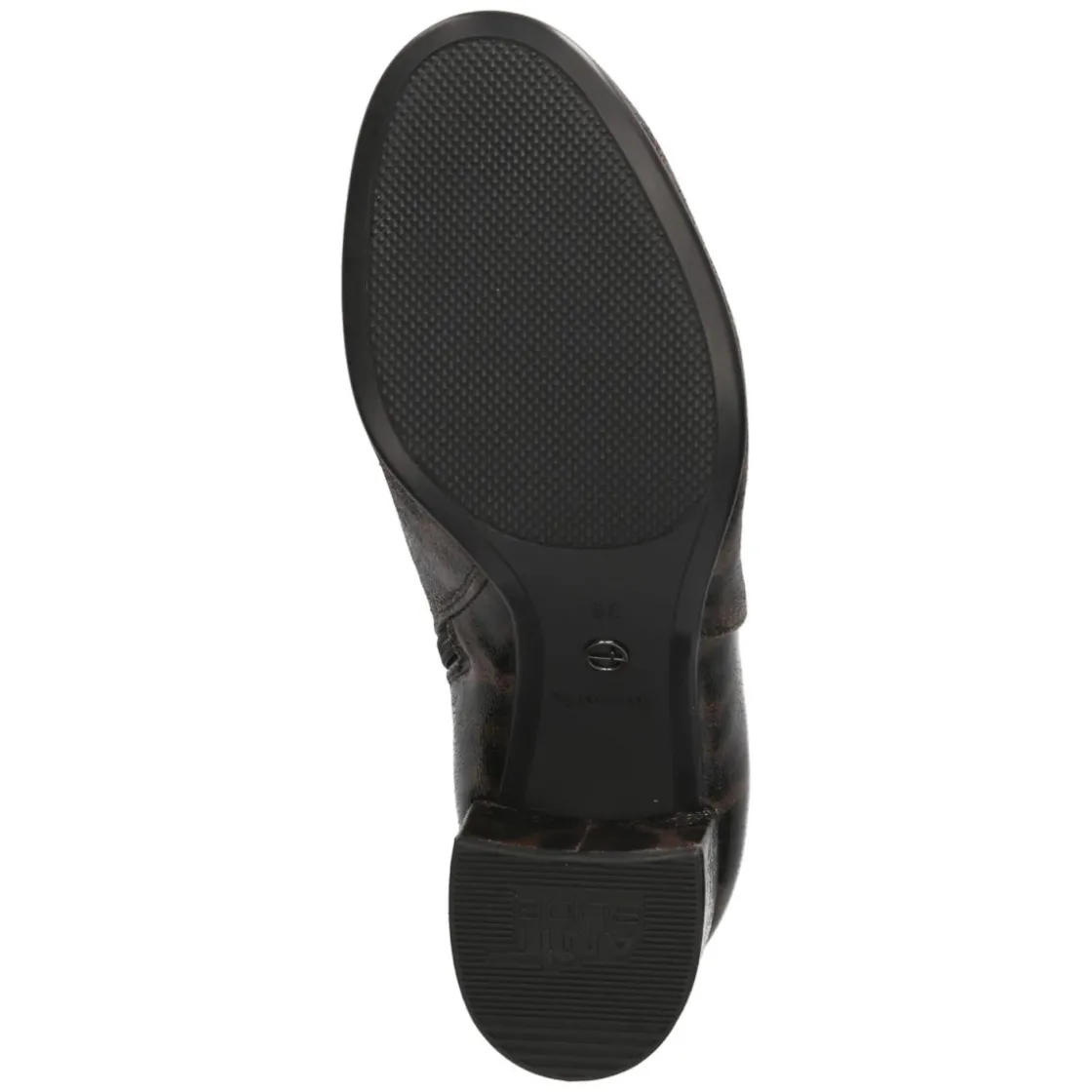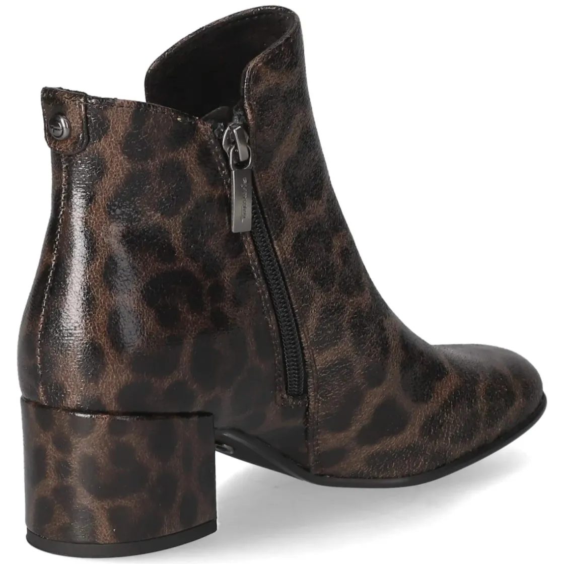 Der Tamaris Ankle Boot verbindet urbane Eleganz mit charakterstarkem Animal Print. Das braune Textil-Obermaterial zeigt eine Leopardenstruktur in used Lackoptik, die dem edlen Auftritt eine moderne Note verleiht. Der 5 cm hohe Blockabsatz sorgt für stabilen Halt, während die runde Schuhspitze und die flexible Laufsohle alltagsfreundlichen Komfort sichern. Ein seitlicher Reißverschluss ermöglicht unkompliziertes An- und Ausziehen, die verstärkte Ferse mit Markenniete setzt einen feinen Akzent. Innen bietet die textile Decksohle mit gepolstertem Fußbett angenehme Dämpfung, ideal für lange Tage zwischen Office und After-Work. Das Modell fällt normal aus und ist aus veganen Materialien gefertigt – stilbewusst von Kopf bis Fuß. Modetipp: Besonders harmonisch zeigt sich der Boot zu schmalen Denim in Schwarz, einem karamellfarbenen Wollmantel und goldfarbenen Details, die die Niete elegant aufgreifen.